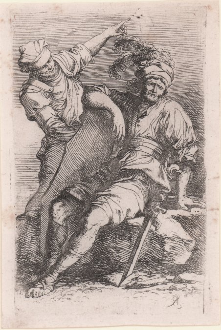Acquaforte e puntasecca, 1656/8 circa, monogrammata in lastra. Della serie conosciuta come ' Diverse Figure. Bellissima prova, ricche di toni, impressa su carta vergata coeva, con sottili margini, in eccellente stato di conservazione. Esemplare in secondo stato, tutte con il monogramma; le prove di primo stato, ove esistano, sono senza monogramma e note in un solo esemplare. Conosciuta con il nome di ' Diverse Figure ' o ' Figurine, rappresentano senza dubbio l’opera grafica più famosa di Salvator Rosa. Già in epoca era considerata un modello per i giovani artisti, e venne più volte copiata sia in Italia che all’estero. Nelle figure dei soldati in costumi esotici oppure d’invenzione il Rosa svolge un tema trattato da molti incisori quali Callot, Della Bella e Filippo Liagno, con il quale aveva un rapporto stretto, e tramite il quale probabilmente arrivò a conoscere i soggetti dei lanzichenecchi del XV secolo di Dürer e Urs Graf. ' Una lettera dell’artista all’amico Ricciardi datata 1656 permette di datare la serie con sicurezza la periodo 1656/8. Bartsch elenca l’opera composta da 61 stampe, mentre Rotili e Wallace descrivano alcune rare variante dei soggetti, poi mai inserite nella serie, portando il numero delle Figurine a 72. Etching and drypoint, circa 1656/8, monogrammed in plate. From the series known as ' Diverse Figure. Beautiful proof, rich in tone, impressed on contemporary laid paper, with thin margins, in excellent condition. Example of the second state, sjowing the Rosa’s monogram; first-state proofs, where they exist, are unmonogrammed and known in only one copy. Known as ' Diverse Figure ' or ' Figurine, they are without doubt the most famous graphic work of Salvator Rosa. Already at that time it was considered a model for young artists, and was copied several times both in Italy and abroad. In the figures of soldiers in exotic or invented costumes, Rosa develops a theme treated by many engravers such as Callot, Della Bella and Filippo Liagno, with whom he had a close relationship, and through whom he probably came to know the subjects of the fifteenth-century Lansquenets by Dürer and Urs Graf. A letter from the artist to his friend Ricciardi dated 1656 allows the series to be dated with certainty to the period 1656/8. Bartsch lists the work as consisting of 61 prints, while Rotili and Wallace describe some rare variants of the subjects, later never included in the series, bringing the number of Figurine to 72. Cfr. Bartsch 46 III/IV; Wallace 40 II/II.