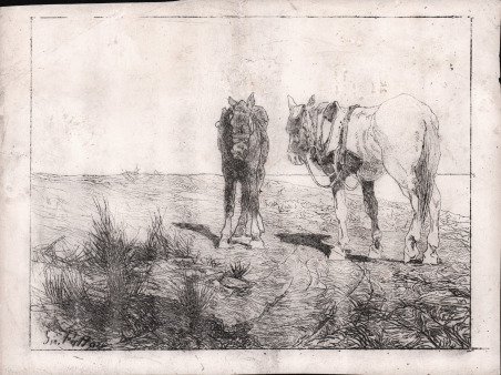 Acquaforte su lastra di zinco, misure 165x218 mm, rifilata all’interno dell’impronta della lastra. Firmata in basso a sinistra “Gio. Fattori”. PROVA DI STAMPA, priva di tratteggio chiaroscurale e di tono di lastra. Impressa su carta avorio, tracce di piega verticale restaurata, per il resto in buono stato di conservazione. Simile ad altre acqueforti dedicate al medesimo motivo ispiratore, quest’opera si caratterizza per la semplicità descrittiva e la pulizia del segno grafico, che definisce gli animali nei minimi dettagli lasciando, invece, soltanto accennato lo sfondo paesaggistico. Fattori coglie il soggetto ritagliandolo quasi dal contesto, inserendolo in una visione spazio-temporale indefinita, costruendolo grazie a linee e zone di contrasto chiaroscurale. Appare evidente, in un’opera come questa, la perfetta adesione tra mezzo espressivo (l’incisione) e soggetto, in un dialogo perfetto tra tecnica e paesaggio. In questa prova di stampa viene meno l’effetto chiaroscurale che probabilmente Fattori volle donare all’opera. Giovanni Fattori, pittore e incisore, viene soprattutto ricordato come uno dei principali esponenti del movimento dei Macchiaioli e come artista di spicco nel panorama ottocentesco, nonché come prolifico incisore dal segno vivace e del tutto personale. Fattori era solito stampare da sé i suoi lavori utilizzando un piccolo torchio, esegue tirature irregolari spesso contraddistinte da una ricerca per gli effetti di chiaroscuro e da un uso sapiente delle velature. Gli esemplari di una stessa lastra sono perciò spesso differenti, più carichi e attenti agli effetti di luce nelle tirature curate dall’autore, meno caldi e più nitidi quelli fatti stampare presso la Calcografia. Il ritratto, i soggetti militari, testimonianza dell’interesse verso i fatti risorgimentali, gli animali della campagna e gli scorci di vita comune sono i soggetti che più lo impegnano. Bibliografia Rudy Chiappini, Giovanni Fattori, Museo d'Arte Moderna, Città di Lugano; Milano: Skira, 2003, ' n. 104. Etching on zinc plate, dimensions: mm 165 x 218; trimmed to the platemark. Signed at lower left "Gio. Fattori." PROOF STATE, lacking chiaroscuro hatching and plate tone. Impressed on ivory paper, traces of restored vertical crease, otherwise in good condition. Close to other etchings dedicated to the same inspirational motif, this work is characterized by the descriptive simplicity and cleanliness of the graphic mark, which defines the animals in the smallest details, leaving, instead, only hinted at the landscape background. Fattori captures the subject by almost cutting it out of context, placing it in an undefined spatiotemporal vision, building it up thanks to lines and areas of chiaroscuro contrast. It seems evident, in a work like this, the perfect adhesion between expressive medium (etching) and subject, in a perfect dialogue between technique and landscape. In this print proof, the chiaroscuro effect that Fattori probably wanted to give to the work is lacking. Giovanni Fattori, a painter and engraver, is mainly remembered as one of the leading exponents of the Macchiaioli movement and as a prominent artist in the 19th-century scene, as well as a prolific engraver with a lively and wholly personal sign. Fattori used to print his works himself using a small press, executing irregular print often marked by a search for chiaroscuro effects and a skillful use of glazing. The examples of the same plate are therefore often different, more loaded and attentive to the effects of light in the prints taken care of by the author, less warm and sharper those made printed at the Calcografia. Portraiture, military subjects, evidence of his interest in Risorgimento events, animals of the countryside and glimpses of common life are the subjects that engage him most. Bibliografia Rudy Chiappini, Giovanni Fattori, Museo d'Arte Moderna, Città di Lugano; Milano: Skira, 2003, ' n. 104. Cfr.