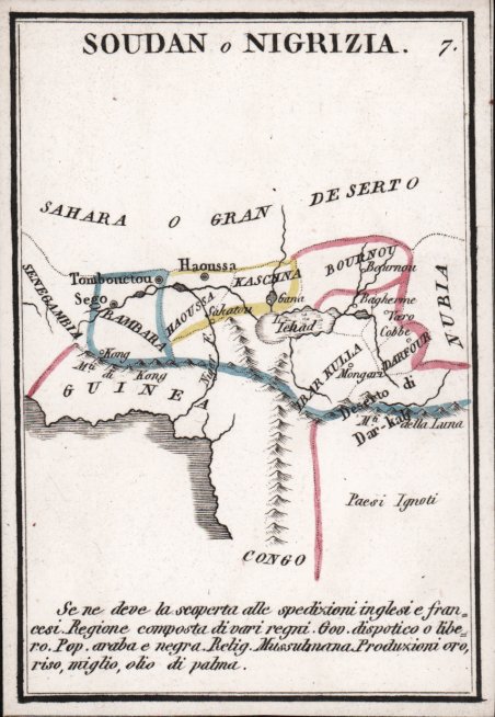 Rara mappa in miniatura tratta dal ' Piccolo Atlante per la Gioventù composte di 40 tavole geografiche con la descrizione delle Superficie, popolazioni, religioni, forma di governo, rendite, armate, ed altre notizie storico statistiche ' di Pietro e Giuseppe Vallardi, stampato a Milano, senza data, ma circa 1830. L'atlante consiste in un titolo e quaranta mappe stampate su carta spessa. Le carte sono divise in quattro serie: Europa, Asia, America e Africa; ogni set contiene nove mappe regionali dei paesi più importanti. Come dice il titolo, ogni mappa fornisce informazioni su geografia, popolazione, religione, governo, entrate e forza militare. Anche se l'atlante non è datato, una data approssimativa può essere accertata dalla mappa di Argentina e Uruguay. Sulla mappa l'Argentina è chiamata ' 'Confederazione del Rio della Plata'. Le Province Unite del Rio de la Plata era il nome iniziale per la nuova Argentina indipendente. Il nome fu abbandonato alla fine del terzo decennio in favore di Argentina. La mappa mostra anche un Uruguay indipendente, quindi dopo il Trattato di Montevideo del 1828. I Vallardi erano una famiglia di rinomati editori milanesi. Al capostipite Francesco (1736-1799) succedettero i figli Pietro, Santo Francesco, Giuseppe e Cesare Paolo. Nel 1812 rimasero in società Pietro (1770-1819) e Giuseppe (1784-1861), che intitolarono (1812) la ditta ai ' Fratelli Vallardi ' distinguendosi nella pubblicazione di libri e stampe d'arte. Dal 1818 Giuseppe, rimasto unico proprietario, diede grande impulso anche al commercio calcografico. Acquaforte, coloritura coeva dei contorni, in ottimo stato di conservazione. Rare miniature map taken from the ' Piccolo Atlante per la Gioventu composte di 40 tavole geografiche con la descrizione delle Superficie, popolazioni, religioni, forma di governo, rendite, armate, ed altre notizie storico statistiche ' by Pietro & Giuseppe Vallardi, published in Milan, circa 1830. The atlas consists of a title and forty maps each printed on thick card. The cards are divided into four sets: Europe, Asia, America, and Africa; with each set containing nine regional maps of the most prominent countries. As the title states, each map gives information upon the geography, population, religion, government, revenues and military strength. ' Although the atlas is not dated, an approximate date maybe ascertained from the map of Argentina and Uruguay. Upon the map Argentina is named the ' ?‘Confederazione del Rio della Plata’. The United Provinces of Rio de la Plata was an early name for the newly independent Argentina. The name was dropped by the end of the 1820s in favour of Argentina. The map also shows an independent Uruguay, which gained its independence at the Treaty of Montevideo in 1828. The Vallardis were a family of renowned Milanese publishers. The progenitor Francesco (1736-1799) was succeeded by his sons Pietro, Santo Francesco, Giuseppe, and Cesare Paolo. In 1812 Pietro (1770-1819) and Giuseppe (1784-1861) remained in partnership, naming (1812) the firm the ' Fratelli Vallardi, distinguishing themselves in the publication of art books and prints. From 1818 Giuseppe, who remained the sole owner, also gave great impetus to the intaglio trade. Etching, contemporary coloring of the outlines, in very good condition. Cfr.