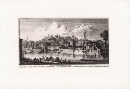 Veduta tratta dalla monumentale opera ' Delle magnificenze di Roma antica e moderna.Pubblicata in 10 volumi dal 1747 al 1761, l’opera presenta 238 incisioni in rame, ciascuna incisione con testo narrativo che fornisce informazioni storiche e documentarie. ' Conosciuto dai più semplicemente come il "maestro" di Giovanni Battista Piranesi, Giuseppe Vasi rivela in quest'opera monumentale la pienezza della sua creatività grafica. I 10 libri che la compongono hanno ognuno un frontespizio con titolo e data diversi: ' Libro primo che contiene le porte e mura; Libro secondo, che contiene le piazze principali di Roma con obelischi, colonne, ed altri ornamenti; Libro terzo, che contiene le basiliche e chiese antiche di Roma; Libro quarto che contiene i palazzi e le vie più celebri; Libro quinto che contiene i ponti e gli edifizj sul Libro sesto che contiene la chiese parrocchiali; Libro settimo che contiene i conventi e case dei chierici regolari; Libro ottavo che contiene i monasteri e conservatorj di donne; Libro nono che contiene i collegj, spedali, e luoghi pii; decimo che contiene le ville e giardini più rimarchevoli. Le ' Magnificenze ' forniscono un panorama completo e al tempo stesso anticonvenzionale dell'Urbe: così, insieme alle consuete, celeberrime inquadrature desunte dalla migliore tradizione vedutistica, si trova anche una Roma insolita, quella che, talvolta, non esiste più. A quest'opera, di centrale importanza nell'editoria romana di metà Settecento, l'Autore aveva lavorato per quasi un ventennio realizzando una monumentale guida dell'Urbe dove accanto alle consuete e celeberrime inquadrature tratte dalla migliore tradizione vedutistica, immortala anche scorci insoliti che sono poi scomparsi con il cambiare della città. Il testo che accompagna le vedute nel primo volume è opera di Giuseppe Bianchini, nel secondo di Orazio Orlandi e nei restanti del Vasi stesso. A partire dall'edizione del 1786, l'opera del Vasi, fu aggiornata dal figlio Mariano, che la pubblicò col titolo ' Raccolta delle più belle vedute antiche, e moderne di Roma, mostrando solo il nome del padre come autore. Questa nuova edizione presentava molte tavole della prima edizione, ed alcune nuove. Anche la pubblicazione di Mariano Vasi fu stampata più volte, sempre con l’aggiunta di nuove tavole. Esemplare senza obelisco, tratto dall'edizione del 1786.La tavola come riporta la didascalia, raffigura anche: 1. Vestigij del Ponte Palatino; 2. Palazzo detto di Pilato; 3. Monte Palatino; 4. Ch. Di S. Maria del Sole; 5. Sbocco della Cloaca massima; 6. Ch. Di S. M. in Cosmedin detta alla bocca della Verità. Acquaforte, stampata su carta vergata coeva, completa dei margini, in ottimo stato di conservazione. ' View taken from the monumental work ' Delle magnificenze di Roma antica e moderna. Published in 10 volumes from 1747 to 1761, the work features 238 copper engravings, each engraving with a narrative text that provides historical and documentary information. Known by most simply as the "master" of Giovanni Battista Piranesi, Giuseppe Vasi reveals in this monumental work the fullness of his graphic creativity. The 10 books that compose it each have a title page with a different title and date: ' Libro primo che contiene le porte e mura; Libro secondo, che contiene le piazze principali di Roma con obelischi, colonne, ed altri ornamenti; Libro terzo, che contiene le basiliche e chiese antiche di Roma; Libro quarto che contiene i palazzi e le vie più celebri; Libro quinto che contiene i ponti e gli edifizj sul Libro sesto che contiene la chiese parrocchiali; Libro settimo che contiene i conventi e case dei chierici regolari; Libro ottavo che contiene i monasteri e conservatorj di donne; Libro nono che contiene i collegj, spedali, e luoghi pii; decimo che contiene le ville e giardini più rimarchevoli. The ' Magnificences ' provide a complete and at the same time unconventional panorama of the City: thus, together with the usual, celebrated shots taken from the best tradition of ' vedutistica, one also finds an unusual Rome, one that, at times, no longer exists. The author had worked on this work, of central importance in Roman publishing in the middle of the eighteenth century, for almost twenty years, producing a monumental guide to the “Urbe” where, alongside the usual and famous shots taken from the best tradition of ' vedutistica, he also immortalized unusual views that have since disappeared with the change of the city. The text that accompanies the views in the first volume is by Giuseppe Bianchini, in the second by Orazio Orlandi and in the remaining ones by Vasi himself. Starting from the edition of 1786, the work of Vasi, was updated by his son Mariano, who published it under the title ' Raccolta delle più belle vedute antiche, e moderne di Roma, showing only the name of his father as author. This new edition presented many plates of the first edition, and some new ones. The publication of Mariano Vasi was also printed several times, always with the addition of new plates. ' View taken from 1786 edition of the Vasi’s ' Delle Magnificenze di Roma Antica e Moderna. Etching, printed on contemporary laid paper, in very good condition. Cfr. Scalabroni,182