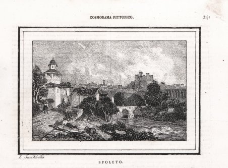 Veduta di Spoleto disegnata da Luigi Sacchi e pubblicata nel Cosmorama Pittorico. Il Cosmorama Pittorico fu una rivista illustrata fondata a Milano da Giovanni Francesco Zini, avvocato. Dal 1835 fu diretto da Giuseppe Sacchi, che la dotò di un'apposita tipografia, e dal cugino Defendente Sacchi fino alla morte di quest'ultimo nel 1840; la direzione grafica venne affidata a Luigi Sacchi. Dopo il 1848 la rivista entrò in crisi e fu chiusa. Luigi Sacchi (Milano, 5 agosto 1805 – Milano, 15 gennaio 1861) è stato un fotografo italiano, pioniere della fotografia in Italia. Luigi Sacchi, venuto a contatto con il mondo dell'arte fin dalla più giovane età per via delle professioni del padre Giuseppe e del cugino Defendente, si iscrisse all'accademia di Brera nel 1822. Dopo un inizio di carriera in campo pittorico, in cui si ispirò a Francesco Hayez e a Pelagio Palagi giungendo ad esporre tra il 1827 e il 1829 sette opere ad olio alle Esposizioni annuali dell'Imperial Regia Accademia, spostò il proprio interesse artistico verso la xilografia e la litografia. Spinto dal desiderio di documentare e divulgare il patrimonio artistico e culturale della penisola italiana attraverso questi mezzi, assunse dal 1835 la direzione grafica della rivista Cosmorama Pittorico la cui direzione generale era affidata al fratello Giuseppe, omonimo del padre, e al cugino Defendente. La rivista ebbe un significativo successo ottenendo richieste di abbonamento da più parti della penisola in un'Italia ancora pre-unitaria. Litografia, inserita in una pagina di testo, in buono stato di conservazione. Veduta di Spoleto disegnata da Luigi Sacchi e pubblicata nel Cosmorama Pittorico. Il ' Cosmorama Pittorico ' fu una rivista illustrata fondata a Milano da Giovanni Francesco Zini, avvocato. Dal 1835 fu diretto da Giuseppe Sacchi, che la dotò di un'apposita tipografia, e dal cugino Defendente Sacchi fino alla morte di quest'ultimo nel 1840; la direzione grafica venne affidata a Luigi Sacchi. Dopo il 1848 la rivista entrò in crisi e fu chiusa. Luigi Sacchi (Milano, 5 agosto 1805 – Milano, 15 gennaio 1861) è stato un fotografo italiano, pioniere della fotografia in Italia. Luigi Sacchi, venuto a contatto con il mondo dell'arte fin dalla più giovane età per via delle professioni del padre Giuseppe e del cugino Defendente, si iscrisse all'accademia di Brera nel 1822. Dopo un inizio di carriera in campo pittorico, in cui si ispirò a Francesco Hayez e a Pelagio Palagi giungendo ad esporre tra il 1827 e il 1829 sette opere ad olio alle Esposizioni annuali dell'Imperial Regia Accademia, spostò il proprio interesse artistico verso la xilografia e la litografia. Spinto dal desiderio di documentare e divulgare il patrimonio artistico e culturale della penisola italiana attraverso questi mezzi, assunse dal 1835 la direzione grafica della rivista ' Cosmorama Pittorico ' la cui direzione generale era affidata al fratello Giuseppe, omonimo del padre, e al cugino Defendente. La rivista ebbe un significativo successo ottenendo richieste di abbonamento da più parti della penisola in un'Italia ancora pre-unitaria. Litografia, inserita in una pagina di testo, in buono stato di conservazione. Cfr.