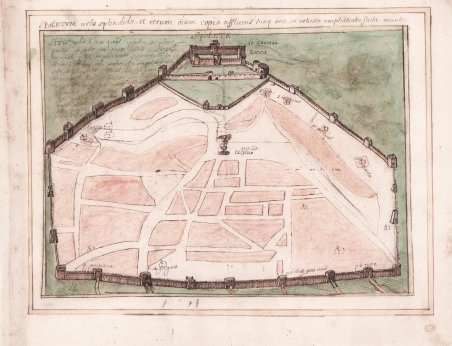 Pianta delle fortificazioni della città, finemente eseguita ad inchiostro e acquarello ' su carta francese con filigrana databile alla metà del XVII secolo.Il foglio era parte di un "Album Amicorum", una raccolta di piante e vedute di città europee interamente manoscritta, venduto in asta a Parigi nel dicembre 2008. ' Successivamente, purtroppo, l'album è stato diviso in singoli fogli che risultano presenti oggi in diverse collezioni private e, occasionalmente, nel mercato antiquario.L'album era composto da una miscellanea di incisioni e manoscritti, quasi tutti raffiguranti piante delle fortificazioni delle principali città europee, con particolare attenzione alle città italiane che, a differenza delle altre opere manoscritte, sono accuratamente rifinite con acquarello dai toni verde e rosa.I manoscritti risultano tutti della stessa mano; molti dei quali con titolo latino ed iscrizioni e commenti in lingua francese. Una sorta di album di disegno da viaggio eseguito da un anonimo autore con grandi conoscenze architettoniche e militari, con probabili finalità di studio preparatorio, probabilmente ispirato ad un opera cartografica a stampa del periodo.Le piante delle città italiane ricordano per molti elementi le opere di Jodocus Hondius Jr. poi inserite nel "Nova et accurata Italiae Hodiernae descriptio" pubblicato a Leida nel 1627.Ottimo stato di conservazione ' per questo ' unico documento sulla città. Plan of the city fortifications, finely executed in ink and watercolour on French paper with a watermark datable to the mid-17th century. The sheet was part of an ' 'Album Amicorum', an entirely handwritten collection of plans and views of European cities, sold at auction in Paris in December 2008. ' ' Subsequently, unfortunately, the album was divided into individual sheets, which can now be found in several private collections and occasionally on the antiques market. The album consisted of a miscellany of engravings and manuscripts, almost all depicting plans of the fortifications of major European cities, with a focus on Italian cities, which, unlike the other manuscript works, are carefully finished with watercolours in green and pink tones. The manuscripts are all by the same hand, many of them with Latin titles and inscriptions and comments in French. A kind of travel sketchbook executed by an anonymous author with great architectural and military knowledge, probably inspired by a printed cartographic work of the period. The plans of Italian cities are reminiscent for many elements of the works of Jodocus Hondius Jr. later included in the ' 'Nova et accurata Italiae Hodiernae descriptio' ' published in Leiden in 1627. Excellent state of preservation for this unique document on the city. Cfr.