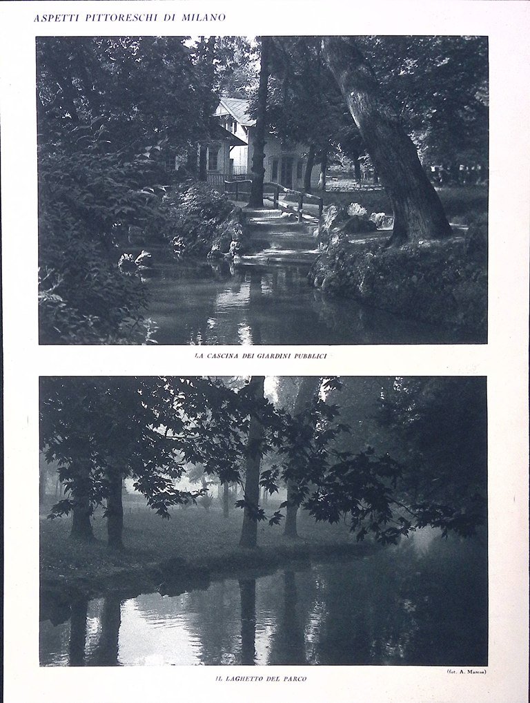 Stampa del 1928 Aspetti di Milano Giardini Pubblici Laghetto Parco Cascina