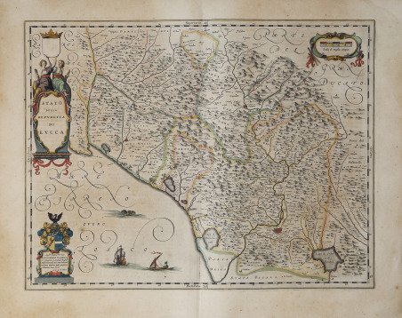 Carta geografica tratta dall'edizione francese dell'Atlas Major di Blaeu, eseguita sul modello di Magini. Willem Janszoon Blaeu, avviò nel 1599 la sua attività di costruttore di globi e strumenti astronomici ad Amsterdam. Nel 1630, dopo aver comprato alcune lastre dell’atlante del Mercator da Jodocus Hondius II, fu in grado di pubblicare un volume di 60 mappe con il titolo di ' Atlantis Appendix. Cinque anni dopo, pubblicò i primi due volumi del suo atlante ' Atlas Novus ' o ' Theatrum Orbis Terrarum, ' in sei libri. Dopo la sua morte, Joan (Johannes) continuò l’opera paterna, completando l’intera serie di sei volume dell’Atlas Novus ' intorno al 1655. Fu inoltre autore di un ' Atlas Maior sive Cosmographia Blaviana, in 12 volumi pubblicati nel 1662 -72, dei quali uno dedicato all'Italia. La carta compare per la prima volta nel terzo volume del ' Theatrum. ' Secondo Koeman viene pubblicata in primis nell'edizione francese del 1640, dal titolo ' Le Theatre du Monde ou Nouvel Atlas, ' Mis en lumiere par Guillaume & Jean Blaeu. ' Troisieme partie. A Amsterdam, Chez Iean & Corneille Blaeu MDCXL. Il terzo volume del ' Theatrum ' contiene 58 carte dell'Italia e 4 della Grecia (cfr. Koeman, ' Atlas Neerlandici, pp. 160-162, Bl 35A). Le carte dell'italia derivano tutte dall'opera di Giovanni Antonio Magini. Tuttavia, sembra più probabile che il Blaeu si basi sue quelle di Hendrick Hondius e Johannes Janssonius pubblicate nel ' Theatrum Italiae in quo Eius Regna, Domina, Ducatus, Et Speciatim Illorum Provinciae, Tabulis Accuratissimis, Iam, De Novo in Lucem Editio, Describunter, Quorum Sequens Pagina Indicabit, stampato ad Amsterdam da Hendrick Hondius nel 1636. ' Sebbene pubblicate dopo la morte di Willem Janszoon Blaeu (1638) le carte spesso recano il suo imprint. Non è dato sapere se fossero tutte già pronte o se i figli Johannes e Cornelis le compilarono postume. Incisione in rame, meravigliosa coloritura coeva, in ottimo stato di conservazione. Map taken from the French edition of the Atlas Major of Blaeu. Willem Janszoon Blaeu, started in 1599 his business as a builder of globes and astronomical instruments in Amsterdam. In 1630, after buying some plates of the Mercator atlas from Jodocus Hondius II, he was able to publish a volume of 60 maps under the title ' Atlantis Appendix. Five years later, he published the first two volumes of his atlas ' Atlas Novus ' or ' Theatrum Orbis Terrarum, in six books. After his death, Joan (Johannes) continued his father's work, completing the entire six-volume ' Atlas Novus ' series around 1655. He was also the author of an ' Atlas Maior sive Cosmographia Blaviana, in 12 volumes published in 1662 -72, one of which was devoted to Italy. The map first appears in the third volume of the Theatrum. According to Koeman it is first published in the French edition of 1640, entitled Le Theatre du Monde ou Nouvel Atlas, Mis en lumiere par Guillaume & Jean Blaeu. Troisieme partie. In Amsterdam, Chez Iean & Corneille Blaeu MDCXL. The third volume of the Theatrum contains 58 maps of Italy and 4 of Greece (see Koeman, Atlas Neerlandici, pp. 160-162, Bl 35A). The maps of Italy are all derived from the work of Giovanni Antonio Magini. However, it seems more likely that Blaeu relies on those of Hendrick Hondius and Johannes Janssonius published in Theatrum Italiae in quo Eius Regna, Domina, Ducatus, Et Speciatim Illorum Provinciae, Tabulis Accuratissimis, Iam, De Novo in Lucem Editio, Describunter, Quorum Sequens Pagina Indicabit, printed in Amsterdam by Hendrick Hondius in 1636. Although published after the death of Willem Janszoon Blaeu (1638) the maps often bear his imprint. It is not known whether they were all ready-made or if his sons Johannes and Cornelis completed them posthumously. Cfr.