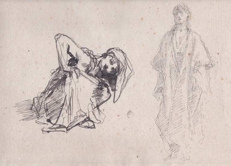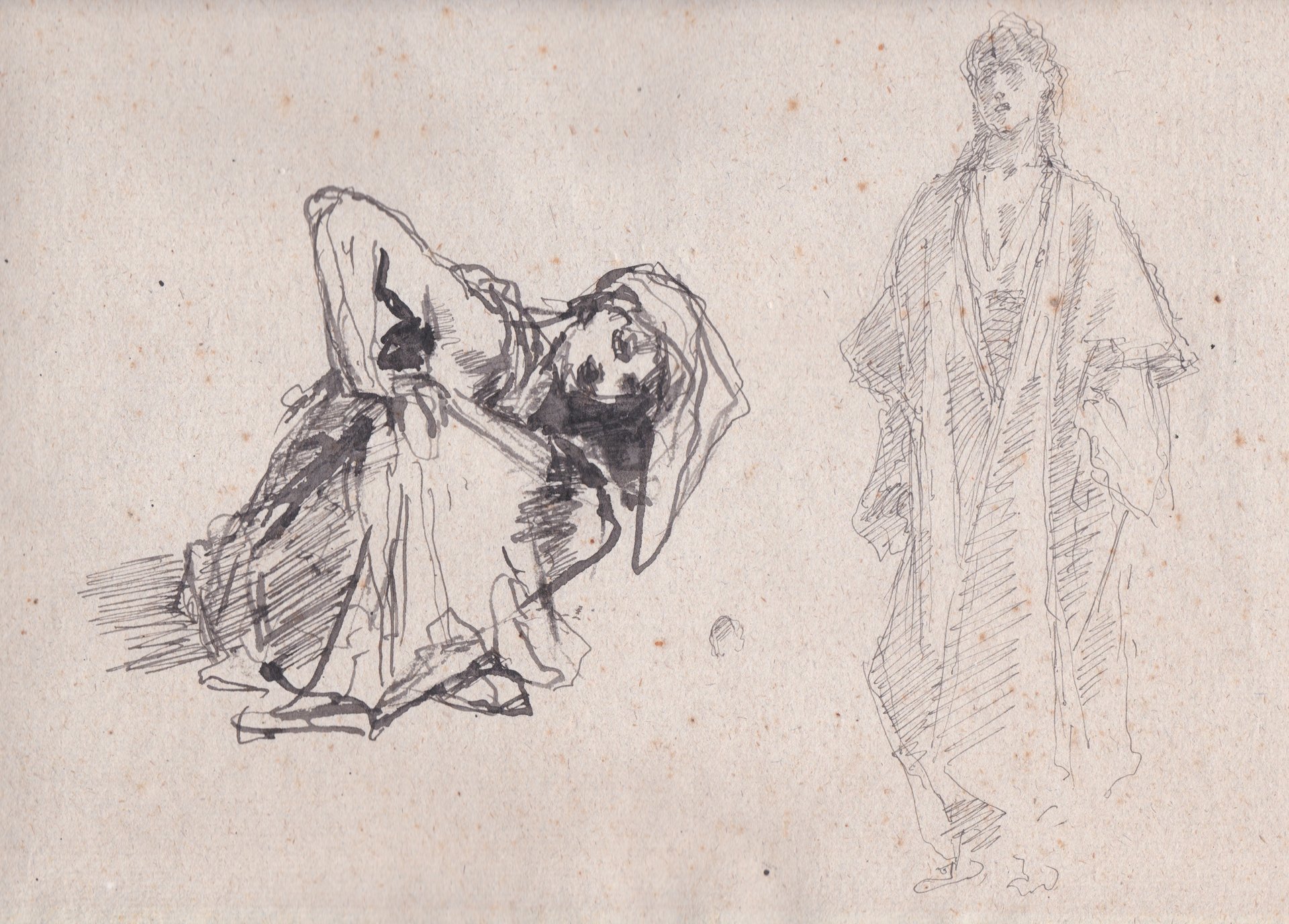 Studio, probabilmente dal vero, di due figure orientali, apparentemente non in relazione fra loro, ma in delicato equilibrio nello spazio del foglio. A sinistra una figura rannicchiata disegnata ad acquerello con un tratto vivace e sicuro attento al chiaroscuro. A destra una figura in piedi rivolta all'osservatore eseguita con un segno leggero a china. Molte sono le composizioni abbondantemente animate a soggetto orientale o di ispirazione biblica dipinte dall’autore con figure simili. In particolare un figura in piedi simile si trova nel dipinto I Posseduti del 1870, oggi conservato presso la Galleria d'Arte Moderna di Roma che illustra l'episodio evangelico della guarigione degli indemoniati di Gerasa. Al verso del disegno a matita: (N 36 disegni) li ultimi sono costati L 800 i piccoli e L 1000 i grandi, scritta probabilmente apposta da un mercante o da un collezionista.