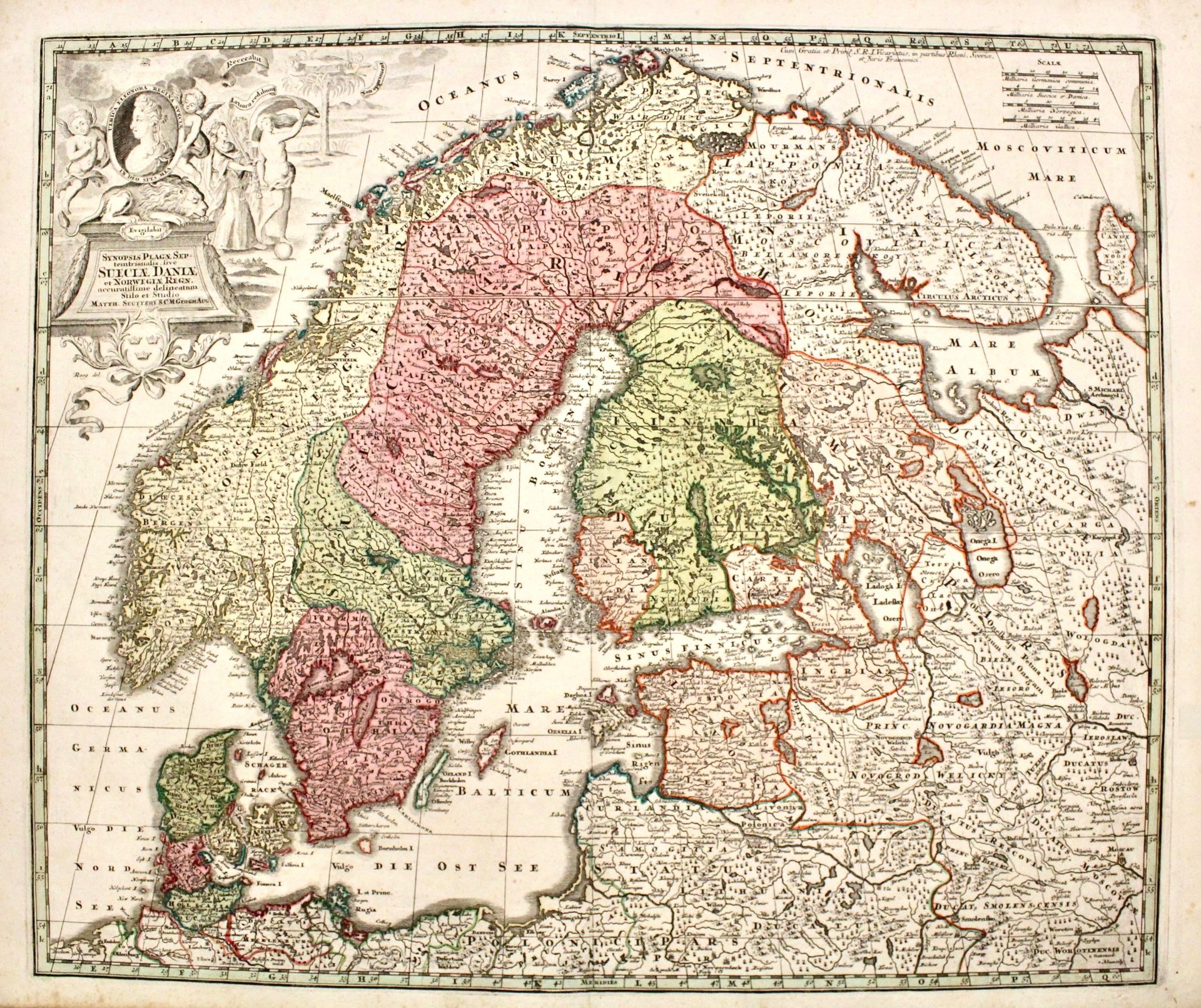 Incisione in rame, dipinta a mano d’epoca, mm 470x590. Mappa assai accurata nella toponomastica di paesi e città, si estende verso est fino ad includere parte della Russia, degli Stati baltici e della parte settentrionale della Germania e della Polonia. Matthaeus Seutter (1678-1757), uno dei più importanti e prolifici editori tedeschi del XVIII secolo; dopo un apprendistato presso Homann a Norimberga, si trasferì ad Augsburg verso il 1720 dove aprì la propria attività superando il maestro sotto il profilo della bellezza: le sue carte hanno sempre colori brillanti e cartigli elaborati. Infatti nella mappa di Scandinavia è presente un grande cartiglo decorativo con varie raffigurazioni allegoriche in alto nell’angolo di sinistra. Tratta da “Atlas novus sive tabulae geographicae totius orbis.” Bell’ esemplare. Minime tracce di fioriture marginali.
