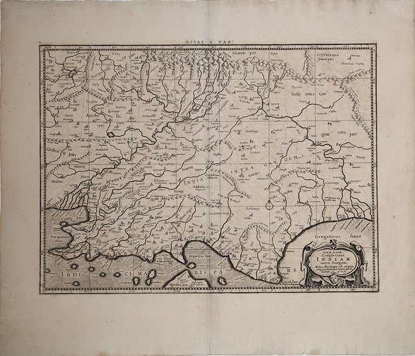 Questa carta presenta la visione tolemaica dell'India. La catena dell'Himalaya si estende sulla parte superiore della carta e i sistemi fluviali dell'Indo e del Gange sono ben delineati. Tuttavia, il subcontinente è notevolmente accorciato e manca di quasi tutta la parte meridionale dell'India. La punta settentrionale di Taprobana (Sri Lanka) appare in basso. Mappa tolemaica della regione, originalmente preparata per illustrare il ' Cl. Ptolemaei Alexandrini, Geographiae Libri Octo, ' pubblicato prima a Colonia da Gottfried von Kempen (1578), ristampato dallo stesso editore nel 1584 (Van der Krogt 1, 502) e poi da Isaac Elsevier per il ' Theatrum Geographiae veteris ' di Petrus Bertius (Leyden 1618). Di tutte le edizioni di Tolomeo, quella di Gerard Kremer (Mercatore), pubblicata nel 1578, e forse tecnicamente la più bella. A questo punto la ' Geografia ' di Tolomeo perdeva pero ogni pretesa di “attualità”, laddove lo scopo di Mercatore era quello di produrre un atlante del mondo classico che servisse da complemento al suo atlante moderno (per tale ragione egli aveva tentato di recuperare la forma originale dell’atlante tolemaico, scartandone le moderne accrezioni). L’opera è celebre anche per la sua longevità, poiché le lastre originali risultavano ancora in uso nel 1730, oltre centocinquanta anni dopo la loro incisione. Esemplare tratto dalla ' Tabulae geographicae Cl: Ptolemei ' di François Halma, stampata tra Utrecht, Amsterdam e Leida nel 1695, 1698, 1704 (2 tirature) e 1730.Le lastre sono emendate e i cartigli completamenti cambiati; più piccoli e realizzati sopra i precedenti – abrasi – lasciando ampie aree bianche sulla stampa. Acquaforte su rame, finemente colorata a mano, in ottime condizioni. This map presents the Ptolemaic view of India. The Himalayan Mountains stretch across the top of the map and the Indus and Ganges river systems are well delineated. However, the subcontinent is considerably shortened and lacks nearly the entire southern part of India. The northern tip of Taprobana (Sri Lanka) appears at bottom. Ptolemaic map prepared for the ' Cl. Ptolemaei Alexandrini, Geographiae Libri Octo, ' first published in Cologne by Gottfried von Kempen (1578) and then reprinted by the same publisher in 1584 (Van der Krogt 1, 502) and then by Isaac Elsevier for the Petrus Bertius’ ' Theatrum Geographiae veteris ' (Leyden 1618). Mercator's interpretation of the 28 Ptolemaic text was possibly one of the truest undertaken up until that time. He had spent 13 years researching, drawing and engraving the maps at much commercial sacrifice to himself, having seen Ortelius's ' Theatrum ' and De Jodes ' Speculum ' published, to become both technical and commercial successes. In later life he devoted himself to his edition of the maps in Ptolemy's ' Geographia, reproduced in his own engraving as nearly as possible in their original form. The work is also famous for its longevity, since the original plates were still in use in 1730, over one hundred and fifty years after their engraving. Example taken from the ' Tabulae geographicae Cl: Ptolemei ' by François Halma, printed between Utrecht, Amsterdam and Leiden in 1695, 1698, 1704 (2 printings) and 1730. The plates are amended and the cartouches completely changed; smaller and made over the previous ones - erased - leaving large white areas on the print. Copperplate, fine later hand colour, good condition. Cfr.