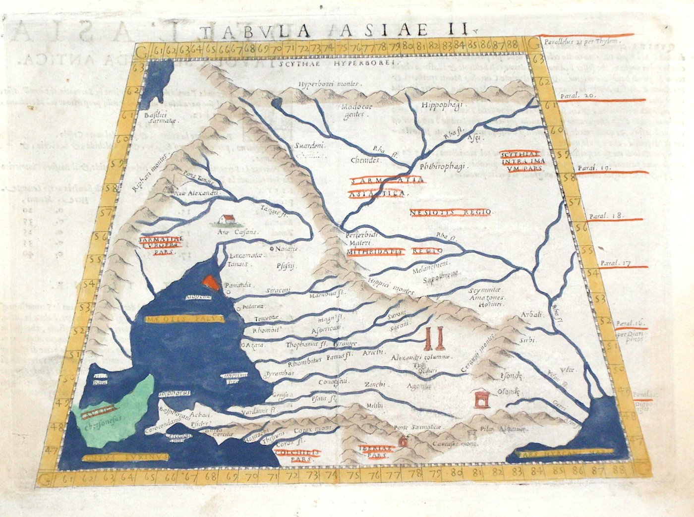 Incisione in rame, colorata a mano, di mm 190x263, tratta dall'edizione veneziana della "Geographia" curata da Ruscelli. Raffigura la Russia. Buon esemplare.