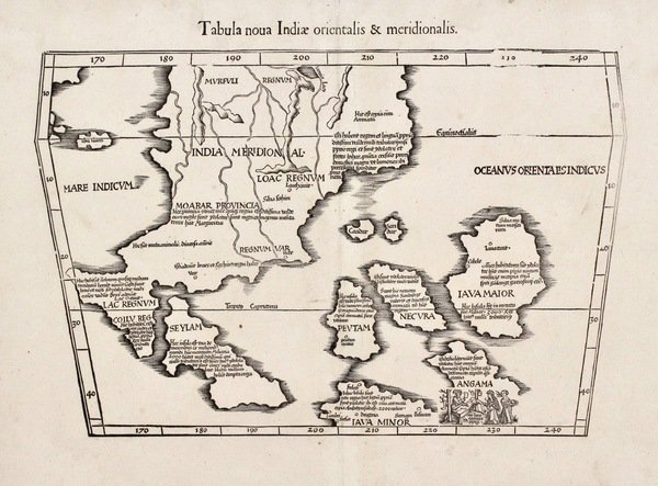 Silografia, mm 280x430. Nessun testo al verso. Carta geografica di fondamentale importanza in quanto si tratta della prima mappa europea raffigurante il sud-est asiatico e dell'unica fino a metà del secolo, inserita appositamente da Fries nell'edizione del 1522 della "Geographia". Eseguita su proiezione trapezoidale si ispira ai viaggi di Marco Polo per quanto riguarda la nomenclatura, mentre cartograficamente prende spunto dalla carta cordiforme del 1507 di Waldseemueller, distaccandosi dal modello tolemaico. Ottimo esemplare perfettamente conservato.