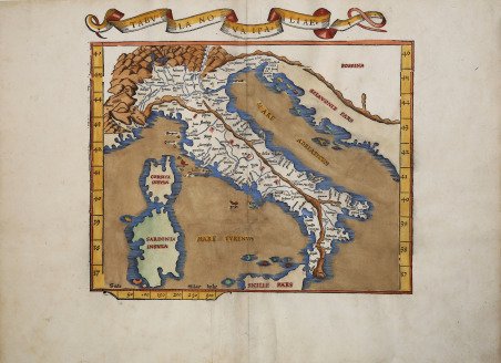 La versione di Laurent Fries della tavola "nuova" dell'Italia.La prima edizione della "Geographia" di Tolomeo curata da Fries fu pubblicata a Strasburgo nel 1522, con le carte che furono copiate e nuovamente incise da quelle di Martin Waldseemüller dell'edizione di Tolomeo del 1520 e testo a cura di Pirckheimer. Nel 1525 viene stampata una seconda edizione a Strasburgo. Alla scomparsa del Fries e del Gruninger, le matrici furono acquistate dai fratelli Melchior e Gaspar Treschel che ne stampano una terza edizione a Lione nel 1535. Per il testo i due editori si servirono della supervisione di Michael Servetus, che curò la revisione del testo del Pirckheimer. Infine, nel 1541, Gaspare Treechsel pubblica a Vienne, nel Delfinato, questa quarta edizione, sempre con testo di Serveto. In questa edizione, rispetto alla prima di Strasburgo del 1522, il testo subì numerose modifiche, correzioni e aggiunte, ma i legni non furono modificati.Esemplare tratto dalla prima edizione di Strasburgo, del 1522, con il titolo in alto racchiuso in una cartiglio a forma di nastro. La matrice lignea non subisce varianti rispetto alle due edizioni precedenti, mentre al verso scompare il testo descrittivo.Nell'ultima edizione del 1541 il titolo in alto viene modificato.Xilografia, finemente colorata a mano, piccolo restauro nella piega in alto perfettamente eseguito, per il resto in ottimo stato di conservazione. Laurent Fries' version of the "new" Italy. The first edition of Ptolemy's "Geographia" edited by Fries was published in Strasbourg in 1522, with maps that were copied and re-engraved from those of Martin Waldseemüller of the 1520 edition of Ptolemy and text edited by Pirckheimer. In 1525 a second edition was printed in Strasbourg. At the death of Fries and Gruninger, the plates were purchased by the brothers Melchior and Gaspar Treschel, who printed a third edition in Lyon in 1535. For the text, the two editors used the supervision of Michael Servetus, who edited Pirckheimer's text. Finally, in 1541, Gaspare Treechsel published in Vienne, in the Dauphiné, this fourth edition, again with Servetus' text. In this edition, compared to the first edition of Strasbourg in 1522, the text underwent numerous changes, corrections and additions, but the wood-blocks were not changed. ' Example taken from the first edition of Lyon, of 1535, with the title at the top enclosed in a cartouche in the form of a ribbon. The wood-block is unchanged from the two previous editions, while the descriptive text disappears on the verso. In the last edition of 1541 the title at the top is modified. ' Woodcur, finely colored by hand, small restoration in the fold at the top perfectly executed, for the rest in excellent condition. Cfr.