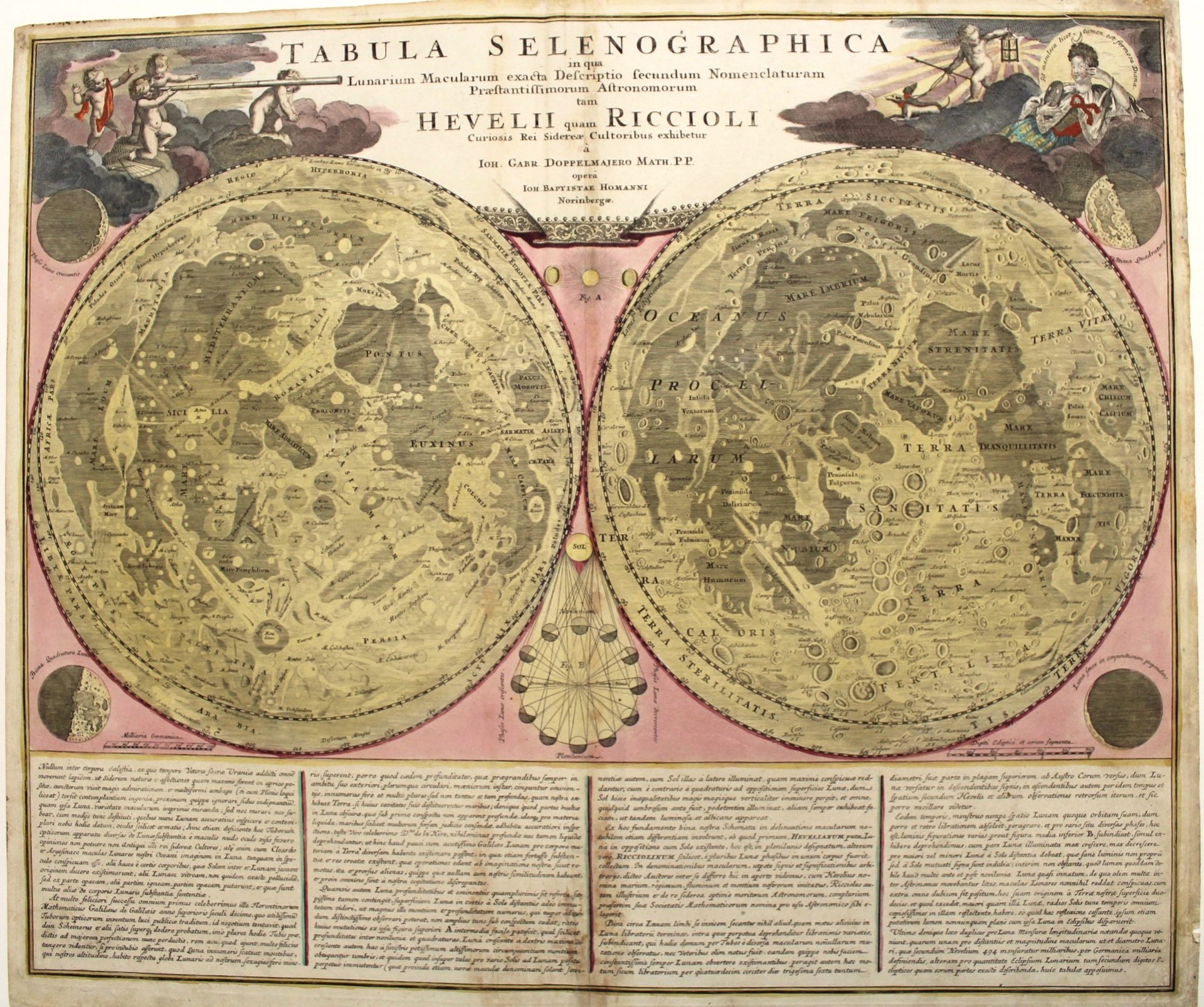 Incisione in rame, mm 490x580 dipinta a mano d’epoca; tratta da “Atlas coelestis”, precedentemente pubblicata nel “Neuer Atlas” di Homann ed in altre opere dell’editore di Norimberga. Importante carta della luna basata sull’opera di Johannes Hevelius (Selenographia, 1647) e Giovanni Battista Riccioli (Almagestum novum 1651) che raffigura i due emisferi lunari con crateri e dettagli accuratissimi, proponendo una analisi comparativa fra le due visioni; putti e figure simboliche sono aggiunti per decorare la tavola. Esemplare in buono stato di conservazione generale, con i consueti margini brevi; qualche brunitura lungo la piega centrale e ai margini, uno strappo restaurato in basso al centro. Whitfield, Mapping of the Heavens, pp. 93, 96-97. Tooley, R.V., Maps and Map-Makers. p. 27. Kanas, Star Maps, pag. 258