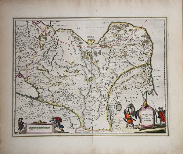 Mappa della Tartaria tratta dall'edizione degli eredi Janssonius delll'Atlas Major, databile dopo il 1656. Joannes Janssonius, figlio dell'editore di Arnhem Jan Janssen, sposò Elisabeth Hondius, figlia di Jodocus Hondius, ad Amsterdam nel 1612. Dopo il suo matrimonio, si stabilì in questa città come libraio ed editore di materiale cartografico. Nel 1618 si stabilì ad Amsterdam accanto alla libreria di Willem Jansz. Blaeu, entrando in una seria competizione. Le sue attività non riguardavano solo la pubblicazione di atlanti e libri, ma anche di mappe singole e un vasto commercio di libri con filiali a Francoforte, Danzica, Stoccolma, Copenaghen, Berlino, Koningsbergen, Ginevra e Lione. Nel 1631 iniziò a pubblicare atlanti insieme a Henricus Hondius. Nei primi anni 1640 Henricus Hondius lasciò l'attività di pubblicazione di atlanti completamente a Janssonius. La concorrenza con Joan Blaeu, figlio e successore di Willem, nella produzione di atlanti spinse Janssonius ad ampliare il suo Atlas Novus finalmente in un'opera di sei volumi, in cui furono inseriti un atlante marino e un atlante del Vecchio Mondo. Dopo la morte di Joannes Janssonius, il negozio e la casa editrice furono continuati dagli eredi sotto la direzione di Johannes van Waesbergen (c. 1616-1681), genero di Joannes Janssonius. Le matrici degli atlanti di Janssonius furono in seguito vendute a Schenk e Valck. Incisione in rame, coloritura coeva, in ottime condizioni. Molto decorativa. Decorative map of China, Tartary and Central Asia, extending from Mongolia and Xanadu to the Caspian and the Volga River and to Tibet and the Upper Ganges River. The Great Wall of China appears prominently. From the Heirs Jansson's Atlas, after 1656. Fine copy. Joannes Janssonius (Arnhem, 1588-1664), son of the Arnhem publisher Jan Janssen, married Elisabeth Hondius, daughter of Jodocus Hondius, in Amsterdam in 1612. After his marriage, he settled down in this town as a bookseller and publisher of cartographic material. In 1618 he established himself in Amsterdam next door to Blaeu’s book shop. He entered into serious competition with Willem Jansz. Blaeu. His activities not only concerned the publication of atlases and books, but also of single maps and an extensive book trade with branches in Frankfurt, Danzig, Stockholm, Copenhagen, Berlin, Koningsbergen, Geneva, and Lyon. In 1631 he began publishing atlases together with Henricus Hondius. In the early 1640s Henricus Hondius left the atlas publishing business completely to Janssonius. Competition with Joan Blaeu, Willem’s son and successor, in atlas production prompted Janssonius to enlarge his Atlas Novus finally into a work of six volumes, into which a sea atlas and an atlas of the Old World were inserted. After the death of Joannes Janssonius, the shop and publishing firm were continued by the heirs under the direction of Johannes van Waesbergen (c. 1616-1681), son-in-law of Joannes Janssonius. The copperplates from Janssonius’s atlases were afterwards sold to Schenk and Valck. Cfr. KOEMAN: Me 184 & 185.