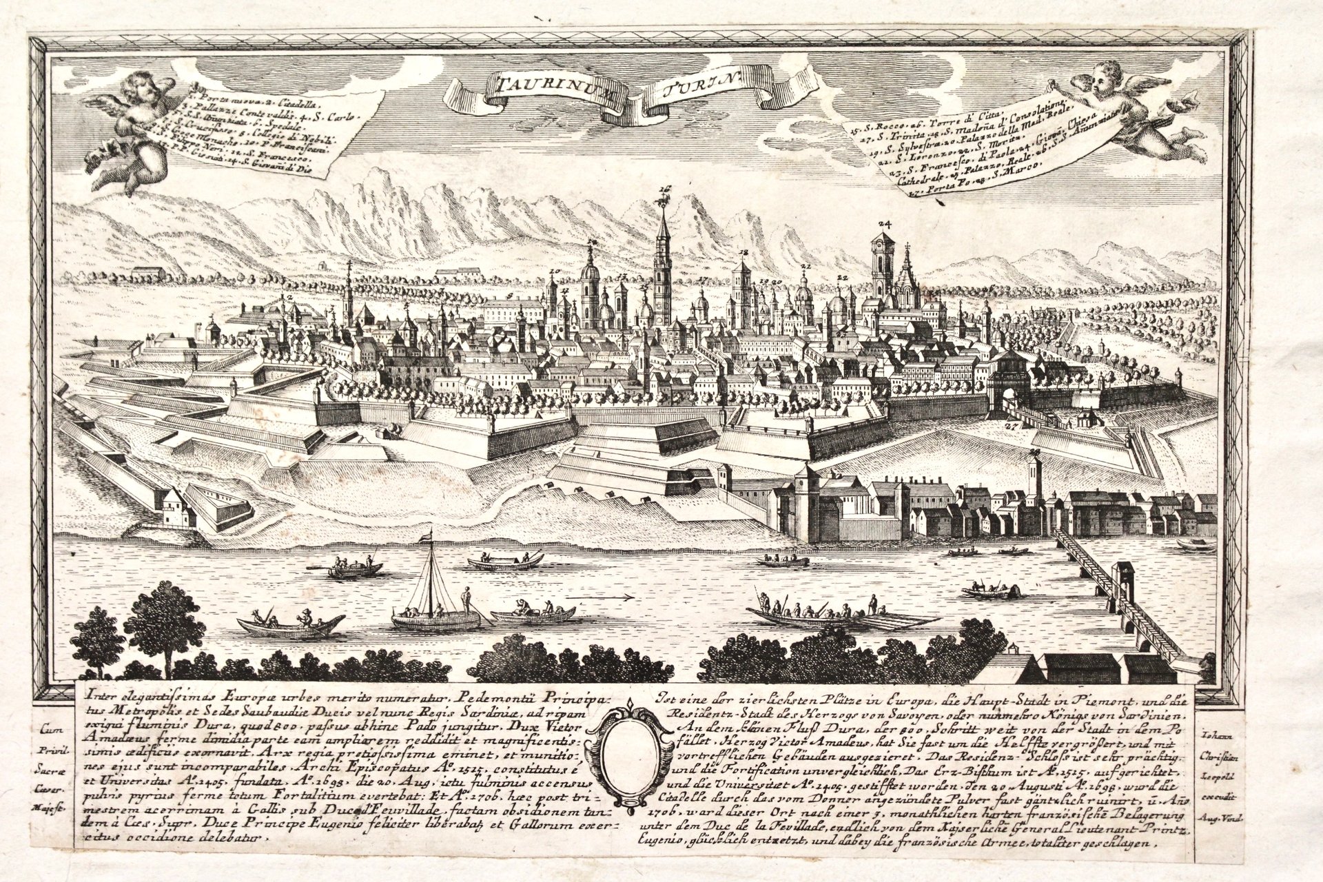 Incisione in rame, mm 197x290. Raro e fascinoso prospetto della città piemontese, eseguito sul modello di Jeremias Wolff. In basso un riquadro contiene note storiche, ripetute in tedesco. Ottimo esemplare nell’inciso, ma rifilato appena fuori di esso.