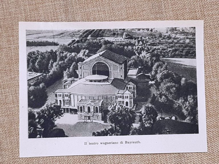 Rara stampa Estratta da pubblicazione del 1944 Festspielhaus di Bayreuth, teatro progettato da Richard Wagner e inaugurato nel 1876 per ospitare esclusivamente le sue opere. Situato sulla cosiddetta “collina verde” a nord della città, il teatro rappresenta una rivoluzione architettonica e scenica, concepita per realizzare il concetto di Gesamtkunstwerk (opera d’arte totale). Il Festspielhaus fu inaugurato con la prima assoluta della Tetralogia dell’Anello del Nibelungo, alla presenza di personalità come Franz Liszt, Nietzsche, Tolstoj, e Camille Saint-Saëns. + Biblioteca personale di Richard Wagner all’interno della Villa Wahnfried di Bayreuth, residenza del compositore costruita tra il 1872 e il 1874. Questo ambiente, oggi parte del Richard Wagner Museum, conserva l’atmosfera originale della casa, con arredi neoclassici, scaffalature in legno, e volumi rilegati che testimoniano gli interessi filosofici, letterari e musicali del maestro. La biblioteca era il luogo dove Wagner studiava, scriveva e riceveva ospiti illustri. Tra i testi conservati figurano opere di Schopenhauer, Goethe, Shakespeare, e trattati di estetica, mitologia e religione. Presente anche il celebre pianoforte Bechstein donato da Ludovico II di Baviera, collocato nella sala adiacente. Dimensioni: Cm 10,00 x 14,00 Codice prodotto X-025 PayPal Carta di credito Bonifico bancario Inserita dentro plico di adeguate dimensioni per proteggerne l'integrità Spedizione con posta ordinaria o raccomandata scelta dall’Acquirente nel momento del pagamento Clicca qui per accedere al nostro Store ed al suo sterminato archivio