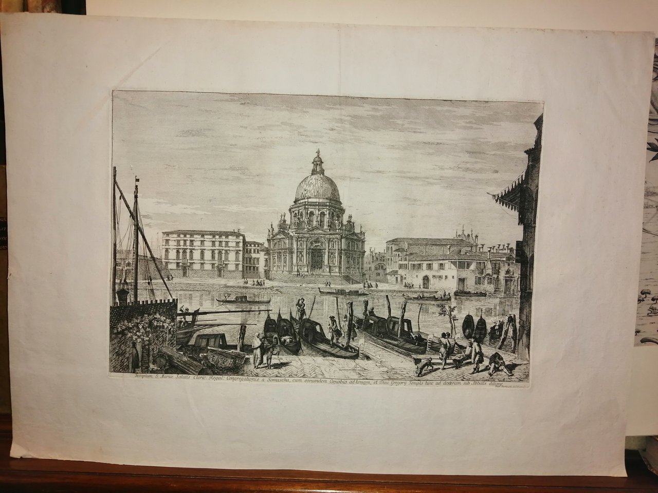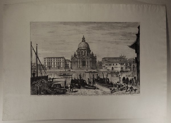 Acquaforte di mm 310 x 420, su fglio di 430 x 495 mm.Vergata grossa. Filigrana FV con 2 stelle. Vergata grossa. I/IV stato. Titolo centrato sul margine inferiore, Mich. Marieschi del.t et inci.t,senza numero. Provenienza: "Magnificentiores selectioresque urbis Venetiarum prospectus, quos olim Michael Marieschi venetus pictor, et architectus in plerisque tabulis depinxit . Vendutur in vico Sancti Lucae apud eundem Auctorem Venetijs 1741 (ma 1742). Succi "La Serenissima nello specchio di rame": "La splendida acquaforte, databile al 1741-42, si colloca tra le ultime quattro incise da Marieschi per la maestria del taglio vedutistico perfettamente equilibrato tra gli episodi di vita quotidiana in primo piano e la visione panoramica dominata dal capolavoro di Baldassarre Longhena. L'incisione è in relazione con due stupende versioni dipinte: The Art Institute, Chicago; vendita Christie's, Londra, 11 Aprile 1986, n.101". Michele Marieschi (1710-1743) figlio di un mediocre pittore, studiò con passione architettura e si staccò presto dal padre. Tornato in patria dalla Germania nel 1735, dipinse belle vedute di Venezia. Nel 1741 (o 1742) diede alle stampe la raccolta di 21 acquaforti tratte dalle sue tele. Le incisioni di Marieschi rendono meglio delle sue pitture quel mondo scenografico e teatrale che la Venezia quotidiana offriva all'occhio dell'osservatore. Succi 1987, 5 I/IV, Montecuccoli degli Erri, Pedrocco 1999, 5 I/IV, Mary Pittaluga 1952, pag.35 e seg. Etching 310 x 420 mm, on a 430 x 495 mm sheet. PV filigree with 2 stars . Coarse rod. I/IV state. Title centered on the lower margin, Mich. Marieschi del.t et inci.t, without number. Provenance: "Magnificentiores selectioresque urbis Venetiarum prospectus, quos olim Michael Marieschi venetus pictor, et architectus in plerisque tabulis depinxit . Vendutur in vico Sancti Lucae apud eundem Auctorem Venetijs 1741 (but 1742). Succi" The Serenissima in the copper mirror" "The splendid etching, datable to 1741-42, ranks among the last four engraved by Marieschi for the mastery of the landscape cut perfectly balanced between the episodes of daily life in the foreground and the panoramic vision dominated by Baldassarre Longhena's masterpiece. The engraving is related to two wonderful painted versions: The Art Institute, Chicago; Christie's sale, London, 11 April 1986, n.101 ". Michele Marieschi (1710-1743), son of a mediocre painter, studied architecture with passion and soon broke away from his father. Returning home from Germany in 1735, he painted beautiful views of Venice. In 1741 (or 1742) he published the collection of 21 etchings taken from his canvases. Marieschi's engravings make better than his paintings that scenographic and theatrical world that daily Venice offered to the eye of the observer. Succi 1987, 5 I/IV, Montecuccoli degli Erri, Pedrocco 1999, 5 I/IV, Mary Pittaluga 1952, page 35 et seq.