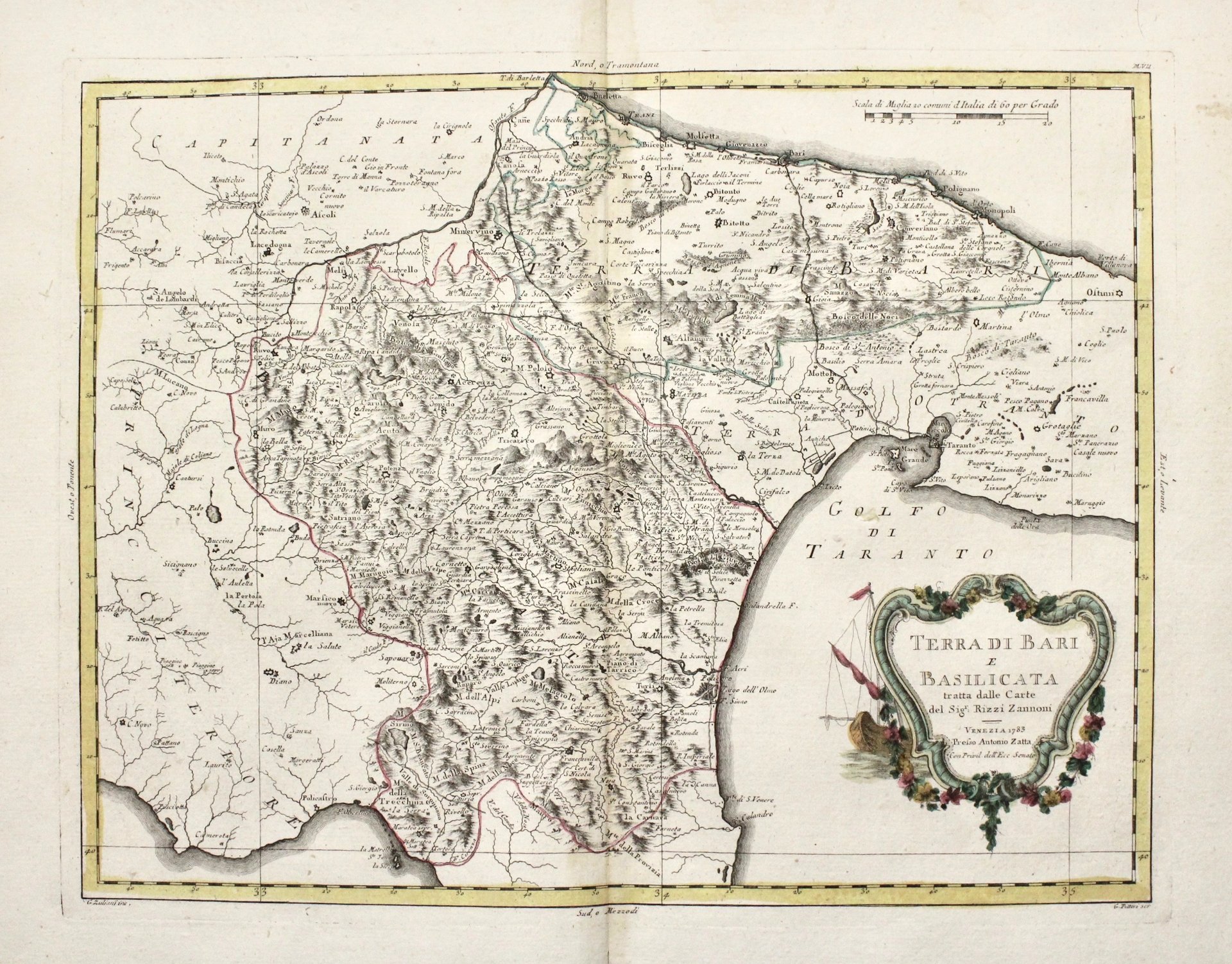 Incisione in rame, mm 325x420, colorata d’epoca. Tratta da “Atlante novissimo”. In basso a sin. piacevole cartiglio. Ottimo esemplare. Antonio Zatta (1775-1797) fu uno dei più importanti editori di carte geografiche del tardo XVIII secolo italiano. La sua opera costituisce un importante punto di passaggio tra la cartografia antica e moderna, più attenta all’accuratezza dei dettagli geografici che all’abbellimento estetico ricco di motivi mitologici o d’invenzione, come era quello dell’epoca precedente. La sua opera più importante è Atlante novissimo pubblicato tra il 1775 e il 1789; i disegni delle illustrazioni furono curate da collaboratori quali Giovanni Marco Pitteri, Anton Friedrich Busching, Pietro Antonio Novelli, ed incise da Giuliano Zuliani. Copper engraving, original color, mm mm 325x420, from “Atlante Novissimo”. Very good condition even if outer margins have been reduced.