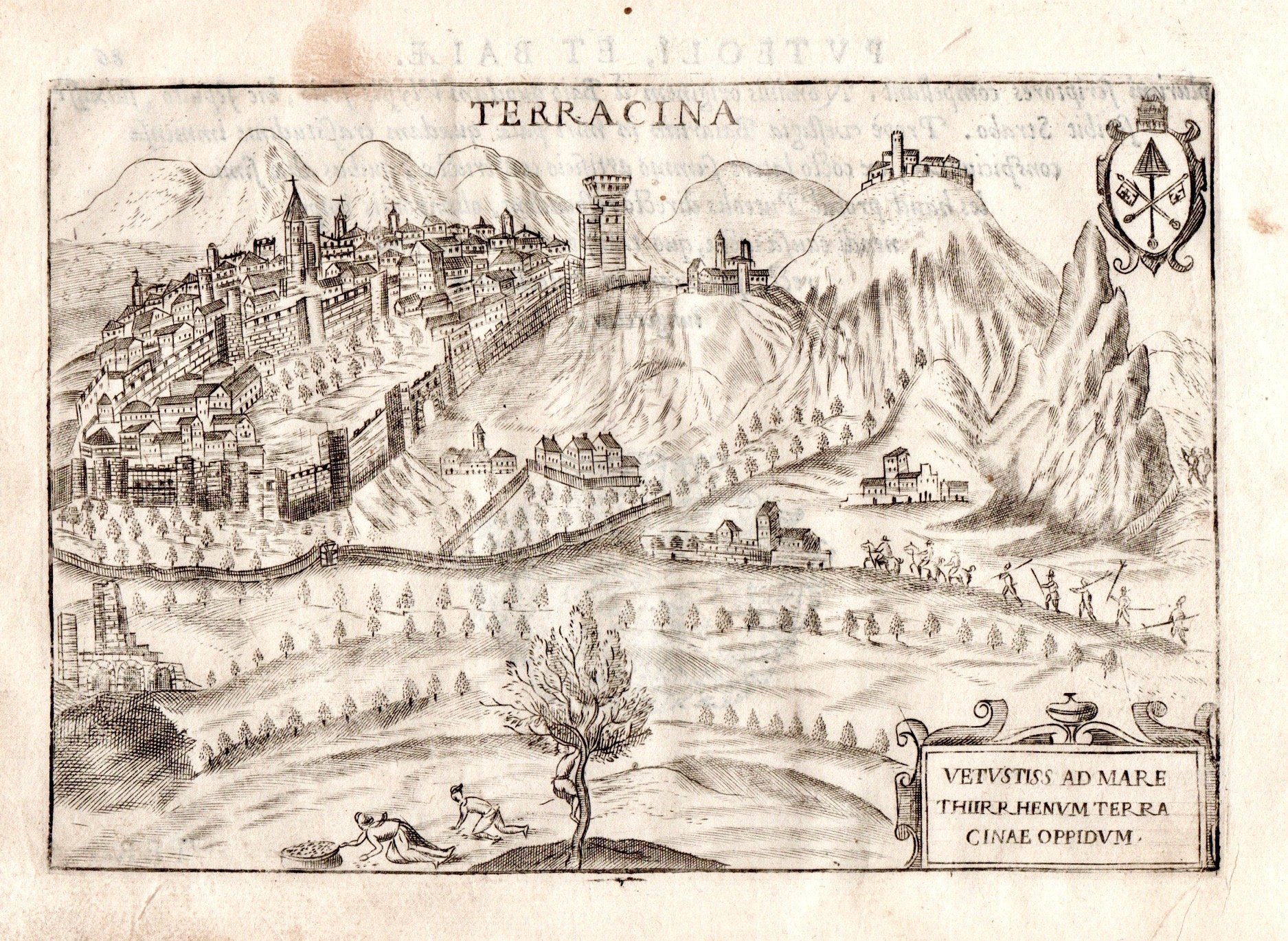 Incisione in rame, dipinta a mano, mm 123x180. Tratta da "Theatrum urbium Italicarum" prima edizione di questa raccolta di piante e vedute di città (senza dubbio da preferire per freschezza di stampa delle lastre alla successiva), ristampata successivamente a Vicenza nel 1616 da Domenico Amadio con l'aggiunta di alcune tavole (67 tavole invece delle 59 originali). Testo latino al verso, di autore ignoto, anche se alcuni studiosi ipotizzano sia dello stesso Bertelli. Buon esemplare con tracce di sporco superficiale all'angolo inf. sin.