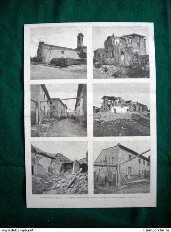 Rara Incisione Estratta da Rivista d'Epoca del 1885 Il Terremoto in Toscana nel 1895 Edifici danneggiati nei comuni di Vogliano e Lappeggi Dimensioni 24x35cm II1895-09 Qualora vogliate delle scansioni migliori contattateci, soddisferemo ogni vostra richiesta. Paypal Carta di credito Bonifico bancario Accuratamente adagiate su un cartoncino e protette da pellicola trasparente rigida il tutto viene inserito dentro plico di adeguate dimensioni per proteggerne l'integrità