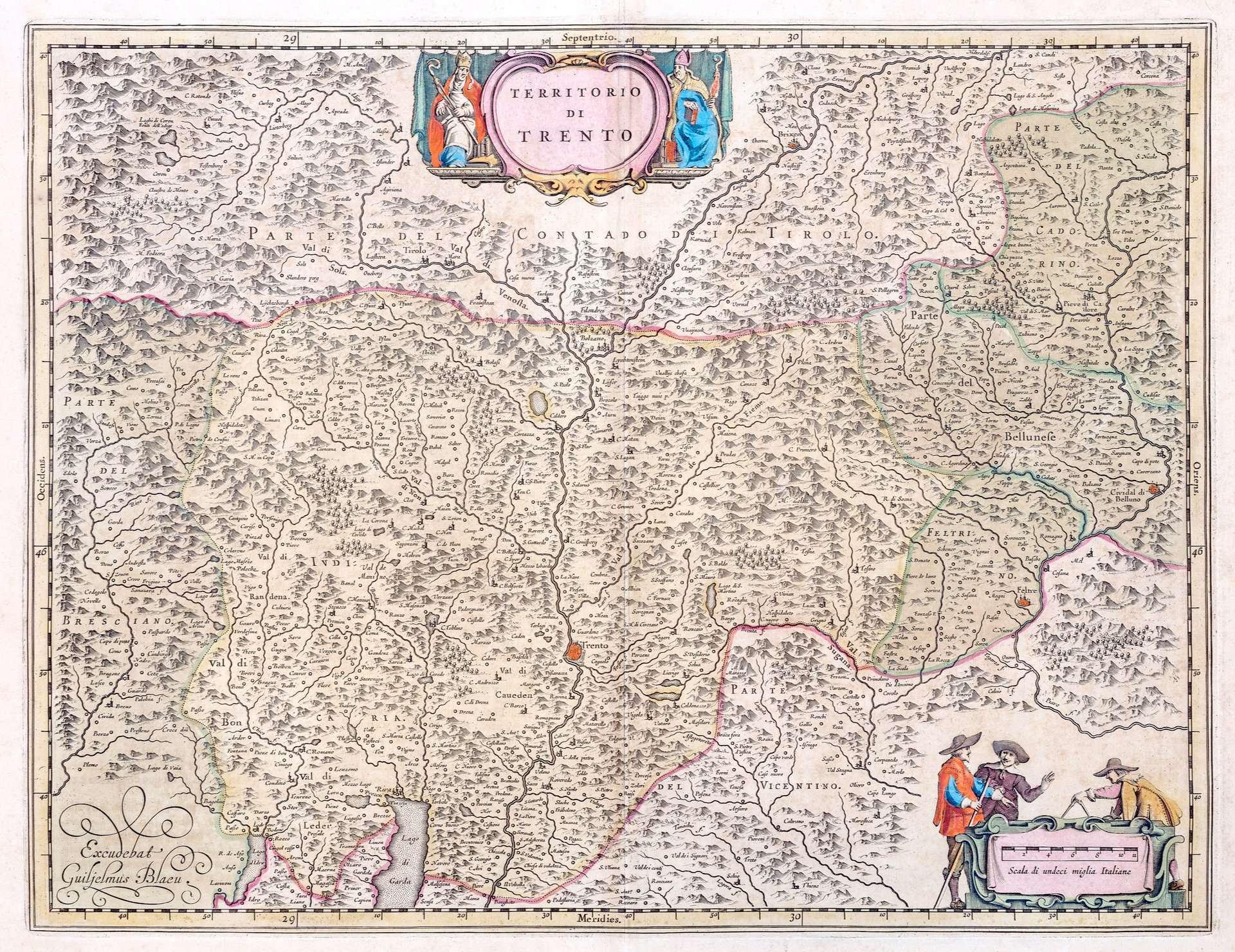 Incisione in rame, colore d'epoca, 385x500. Elegante carta eseguita sul modello di Magini. Buon esemplare in coloritura a tutto campo ma leggermente brunito. W. Blaeu, astronomo allievo di Tycho Brahe, fondò un'officina per la costruzione di globi nel 1599; quasi immediatamente iniziò a pubblicare anche carte geografiche, giungendo nel 1630 alla creazione del primo atlante "Atlantis Appendix" e cinque anni dopo, della prima edizione in due tomi del "Atlas Novus". Dopo la sua morte nel 1638, a cura del figlio Johan si giunse nel 1662 alla pubblicazione del celebre "Atlas Maior" in 11 volumi. Nel 1672 un incendio distrusse l'officina e segnò la fine dell'attività. <BR><BR>