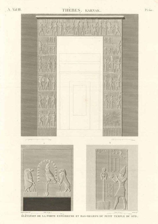 Thèbes. Karnak - Elévation de la porte extérieure et bas.rliefs du petit temple du sud