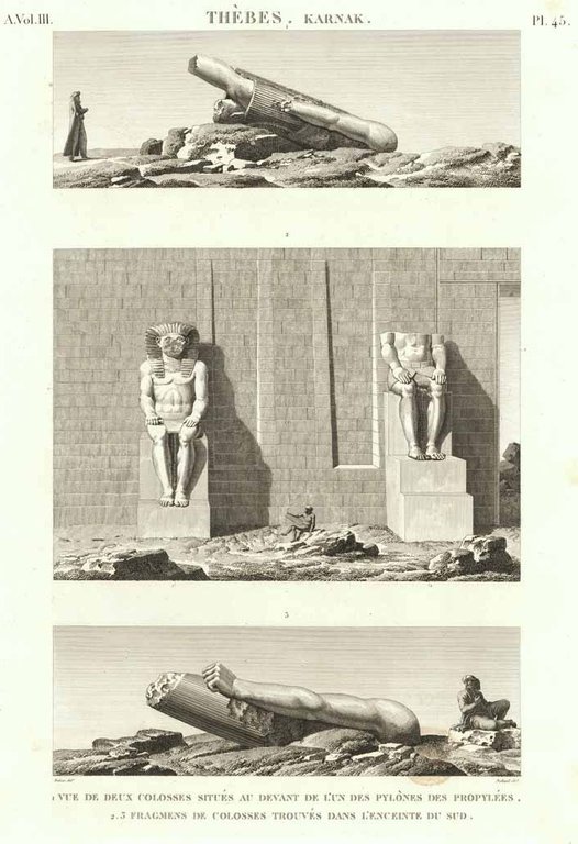 Thèbes. Karnak - Vue de deux colosses situés au devant de l'un des pylones des propylées: Fragmens de colosses trouvés dans l'enceinte du sud.