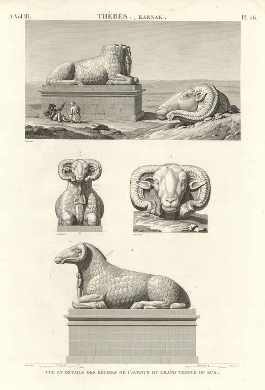 Thèbes. Karnak - Vue et deétails des Béliers de l'avenue du grand temple du sud