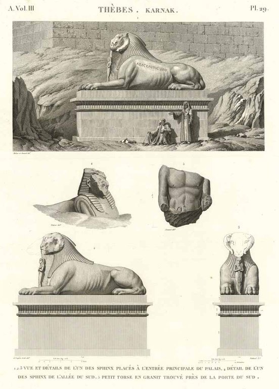 Thèbes. Karnak - Vue et détails de l'un des sphinx placés à l'entrèe principale du palais. .