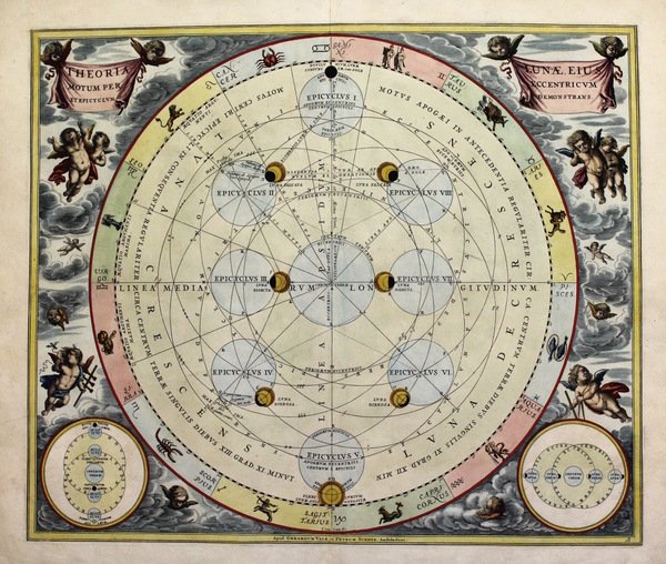 Nice example of this celestial chart illustration of the moon epicicles from the 1708 Valk & Schenk edition of Andreas Cellarius's Harmonia Macrocosmica seu Atlas Universalis et Novus. This beautiful chart illustrates the Ptolemaic model of lunar motion. The epicycles of the moon are shown as it revolves along its various orbits. The central diagram is bordered by the signs of the Zodiac and surrounded by superb engravings of clouds filled with putti, the title banners and two smaller diagrams. Engraved by Joannes van Loon.<BR>Andreas Cellarius Harmonia Macrocosmica (first published in 1660) is generally regarded as one of the most spectacular cosmographical atlases that was published in the second half of the seventeenth century. The atlas was published in 1660 and 1661 by the Amsterdam publisher Johannes Janssonius (1588-1664), as a cosmographical supplement to his Atlas Novus. Andreas Cellarius had already started working on this atlas before 1647 and intended it to be a historical introduction for a two-volume treatise on cosmography but the second part was never published. His atlas contained a description of ancient and contemporary astronomy including the theories of Ptolemy, Copernicus, and Tycho Brahe. The atlas was illustrated with twenty-nine engraved plates that are among the most beautiful celestial charts ever made. The charts include illustrations of the heavens and diagrams of the orbits of the Sun, Moon, and planets according to the different cosmological theories. They were richly adorned with elaborate cartouches and baroque elements such as putti in clouds, shells, garlands, as well as portraits of famous astronomers and astronomical instruments.<BR>The plates of his Harmonia Macrocosmica were reprinted (without the Latin commentary) in 1708 by the Amsterdam publishers Gerard Valk (1651-1726) and Peter Schenk (1660-1711). Some restored tears in outer margin and at centrefold, affecting at bottom the border frame <BR>