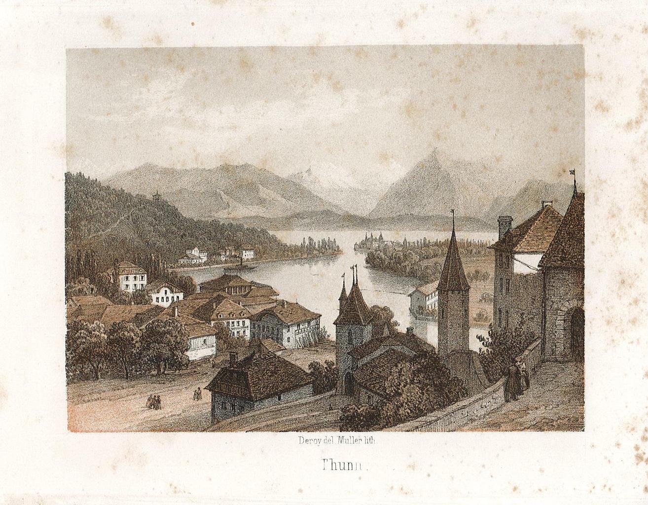Veduta, antica ed originale, stampata a colori della cittadina di Thun. Autore: Deroy del & Muller lith. Luogo: Thun. Anno: 1840 ca. Tecnica: litografia. Dimensioni: 100x135 mm