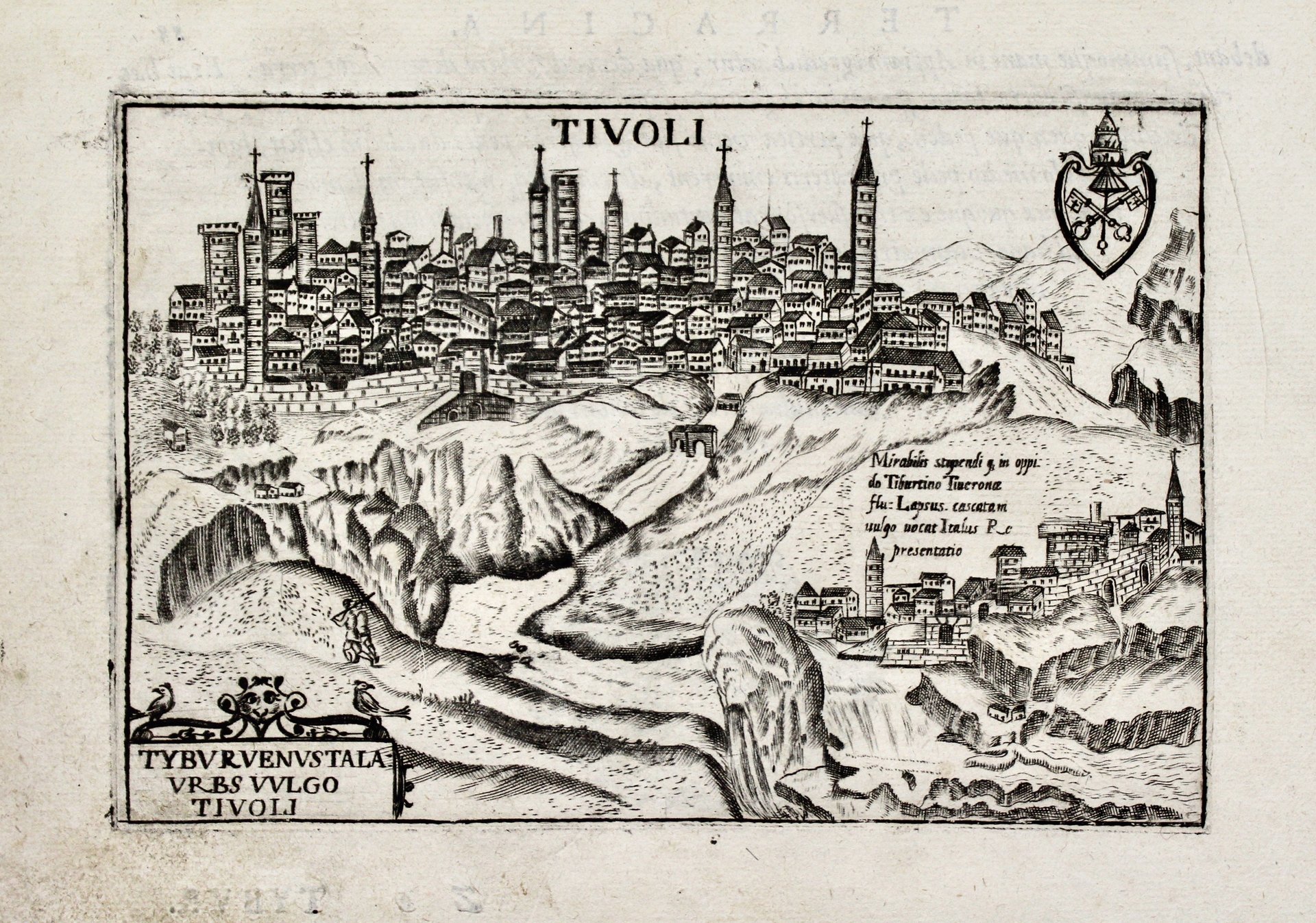 Incisione in rame, mm 120x180. Tratta da "Theatrum urbium Italicarum" prima edizione di questa raccolta di piante e vedute di città (senza dubbio da preferire per freschezza di stampa delle lastre alla successiva), ristampata successivamente a Vicenza nel 1616 da Domenico Amadio con l'aggiunta di alcune tavole (67 tavole invece delle 59 originali). Testo latino al verso, di autore ignoto, anche se alcuni studiosi ipotizzano sia dello stesso Bertelli. Ottimo esemplare.