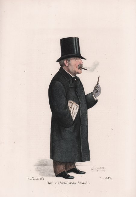 Litografia con coloritura coeva, 1877 circa, firmata in basso ' A. Manganaro. Tavola della celebre serie “Il Palazzo S. Giacomo, Album degli 80 al Municipio di Napoli 1876 e 1877” raccolta di immagini satiriche raffiguranti i rappresentanti dell’amministrazione comunale di Napoli. Vengono effigiate, pertanto, le più importanti figure comunali; giudici, avvocati, architetti, geometri, marittimi etc. sono disegnati con tratti caricaturali e associati con chiari elementi che contraddistinguono la loro professione. Nel 1877 Antonio Manganaro (Manfredonia 1842 – Napoli 1921), uno dei più celebri disegnatori satirici della Napoli della seconda metà del ‘800, dà alle stampe le tavole litografate a colori de ' Il Palazzo S. Giacomo Album degli 80 al Municipio di Napoli 1876 e 1877 ' che ritraggono con tratti caricaturali i rappresentanti dell’amministrazione comunale partenopea di quegli anni. Sul retro di ogni tavola un’ironica biografia racconta le vicende umane e professionali del personaggio raffigurato. Nella copertina dell’Album degli 80 ' ad accogliere il lettore è Ferdinando Ramognini, Delegato Straordinario (oggi si direbbe Commissario) del Municipio di Napoli, nominato dal governo il 1° maggio 1876, a seguito dello scioglimento del consiglio comunale. Di origini liguri, Ramognini (1829 – 1898) era stato uomo di fiducia di Cavour che ne aveva favorito la carriera in ambito governativo. Prima e dopo l’esperienza commissariale napoletana, terminata nel luglio del 1876, fu prefetto in varie città italiane e senatore del Regno d’Italia dal 1892 fino alla morte. L’uomo politico è ritratto da Manganaro in un elegante abito scuro su cui fa bella mostra l’onorificenza di Casa Savoia mentre apre una tenda come un sipario teatrale per mostrare l’entrata in Palazzo San Giacomo del Sindaco Gennaro Sambiase Sanseverino Duca di San Donato con la sua mole poderosa, icona inconfondibile della politica napoletana postunitaria, seguito da consiglieri. ' ' ' ' ' ' ' ' ' ' ' ' Tra le ottanta divertenti caricature dei rappresentanti comunali, tutti argutamente descritti con le proprie particolari caratteristiche fisiognomiche e con sottotitoli che in brevi motti ne sintetizzano l’occupazione o l’indole, va menzionata quella di Camillo Minieri Riccio (Napoli 1813 – ivi 1882), autore di importanti testi sulla storia della dominazione angioina e in generale del regno napoletano. Lo studioso ebbe incarichi di prestigio quali la direzione della Biblioteca di San Giacomo (1863), la nomina di rappresentante della Commissione Municipale per la conservazione dei monumenti (1869) e la direzione dell’Archivio di Stato di Napoli (1874). Nel disegno di Manganaro l’anziano consigliere, a testimonianza dei suoi precipui interessi di studio, è ritratto in una disordinata biblioteca, appollaiato sulla cima di uno scaletto, immerso nella lettura di un grosso volume circondato da altri libri poggiati sui pioli, pronti per essere consultati. ' ' ' ' ' ' ' ' ' ' ' ' Con la sua graffiante matita Manganaro, come altri celebri caricaturisti attivi in quegli anni a Napoli, quali Melchiorre de Filippis Delfico, Enrico Colonna e Mario Buonsollazzi in arte Solatium, prendendo spunto dagli avvenimenti quotidiani, mette alla berlina, ma con garbo ed eleganza, noti personaggi del mondo della politica e della cultura su Album, strenne illustrate e soprattutto giornali satirici come ' L’Arca di Noè, Il bello Gasparre .e basta così, Il Caporal terribile., ' assai diffusi all’indomani dell’Unità d’Italia. In particolare, furono ricercatissime le caricature pubblicate in ' Montecitorio Album dei 500 ' (1872-1874), nel volume ' Consiglio Provinciale di Napoli ' (1880) con gustose caricature di ministri e parlamentari e dei consiglieri provinciali e nell’Album A zonzo ' per le sale dell’Esposizione di Belle Arti di Napoli ' (1877) in cui prende in giro gli artisti del suo tempo. Lithograph with contemporary coloring, circa 1877, signed at bottom ' A. Manganaro. Plate from the famous series ““Il Palazzo S. Giacomo, Album degli 80 al Municipio di Napoli 1876 e 1877” collection of satirical images depicting representatives of the municipal administration of Naples. The most important municipal figures are portrayed; judges, lawyers, architects, surveyors, seafarers etc. are drawn with caricature features and associated with clear elements that distinguish their profession. In 1877 Antonio Manganaro (Manfredonia 1842 - Naples 1921), one of the most famous satirical draughtsmen of Naples in the second half of the 19th century, gave to the presses the color lithographed plates of ' Il Palazzo S. Giacomo Album degli 80 al Municipio di Napoli 1876 e 1877, ' which portray with caricature strokes the representatives of the Neapolitan municipal administration of those years. On the back of each plate, an ironic biography recounts the human and professional events of the person depicted. On the cover of the ' Album degli 80 ' to welcome the reader is Ferdinando Ramognini, Delegato Straordinario (today we would say Commissioner) of the Naples City Hall, appointed by the government on May 1, 1876, following the dissolution of the city council. Of Ligurian descent, Ramognini (1829 - 1898) had been a trusted man of Cavour, who favored his career in government. Before and after his Neapolitan commissarial experience, which ended in July 1876, he was prefect in several Italian cities and senator of the Kingdom of Italy from 1892 until his death. The politician is portrayed by Manganaro in an elegant dark suit on which the honorific of the House of Savoy is beautifully displayed as he opens a curtain like a theatrical curtain to show the entrance into Palazzo San Giacomo of Mayor Gennaro Sambiase Sanseverino Duca di San Donato with his mighty bulk, an unmistakable icon of post-unification Neapolitan politics, followed by councilors. ' ' ' ' ' ' ' ' ' ' ' ' Among the eighty amusing caricatures of 