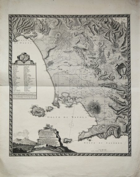Rara carta fisica e topografica della Campania, delineata da Giovanni Antonio Rizzi Zannoni su commissione e sulla base di informazioni di Scipione Breislak. Acquaforte, 1797 circa, impressa su carta vergata coeva, con margini, in eccellente stato di conservazione. ' Il geologo di origine svedese Scipione Breislak (1750- 1826), aveva condotto lunghi e interessanti studi su parecchie zone vulcaniche dell'area napoletana, e aveva commissionato al Rizzi Zannoni una carta sulla “Topografia fisica della Campania”. Contrariamente a quanto si possa immaginare, la carta non era di corredo a un volume sulla geologia della Campania ma, come l'autore ricorda nella prefazione all'edizione fiorentina, “quest'opera non è altro che la spiegazione di una carta, che ho fatto incidere ad oggetto di ravvisare in un colpo d'occhio la costituzione fisica della Campania” La carta fu realizzata da Rizzi Zannoni e incisa nel 1797 da Giuseppe Guerra, ma alcune disavventure editoriali e gli incalzanti avvenimenti politici di quegli anni non consentirono di utilizzare tale incisione nella sua opera. Nel 1798, Breislak fu chiamato a Roma dal governo repubblicano, costituitosi nel febbraio, e fece parte del gruppo di intellettuali riuniti intorno al Monitore di Roma. La prima edizione del volume riporta lo stesso titolo della carta e fu realizzata a Firenze nel 1798, ma è priva della carta topografica, in quanto il rame, di proprietà di Rizzi Zannoni, era rimasto a Napoli. Solo in quella di Parigi del 1801, in due volumi, intitolata Voyages physiques et lithologiques dans la Campanie, Breislak riesce ad inserire la carta geologica. Si tratta però di una copia pressoché fedele di quella delineata da Rizzi Zannoni nel 1797, intitolata più semplicemente "Carte Physique de la Campanie", della stessa dimensione e nella stessa scala, incisa da Thuillier (figlio) e scritta da Miller. L'evidenza dell'orografia è sorprendente (certamente si deve alla mano di Alessandro D'Anna) e sono individuati con estrema chiarezza tutti i crateri vulcanici che interessano la Campania e le sue isole. La carta è accompagnata da una legenda con 64 richiami numerici, mentre con le lettere dalla A alla H sono indicate le "Lave principali sortite dal Vesuvio in questo secolo". Una nota avverte che "I quadrati né quali è graticolata la carta sono di 5. miglia Napoletane, 60. delle quali corrispondono ad un grado". Il reticolo non è orientato in direzione nord-sud, poiché è parallelo alla cornice della carta, la quale risultata orientata con il nord inclinato di 10° verso oriente. L'unico elemento di orientamento della carta è costituito dal Meridiano di Napoli che passa per Castel Sant'Elmo, una sorta di firma scientifica di Rizzi Zannoni. ' La carta è dedicata a “La Sig. Contessa Skawronsky Nata Baronessa Strogonow Dama di ritratto di S.M. Imp. delle Russie Cavaliere dell'ordine di S. Caterina”. A lei è dedicata anche la prima edizione fiorentina del volume, nel quale Breislak ricorda il coinvolgimento della nobildonna nella esecuzione della carta e come lei, "senza punto esitare", fornì "i mezzi per facilitarne l'esecuzione". La dedicataria, Ekaterina von Egelhardt (1761-1829), era nipote di Grigorij Aleksandroviè PotCmkin (1739-1791) e dal 1784 era a Napoli come moglie Pavel Martinovic Skavronskij, nominato ambasciatore russo presso la corte di Napoli. Poiché, dopo la morte del marito nel 1794, lei tornò in Russia, è probabile che la realizzazione della carta sia stata avviata prima di quella data (cfr. V. Valerio, L’Italia del Cavaliere Rizzi Zannoni, 2014, pp. 68-69, scheda 27). Magnifico esemplare di questo importante rilievo cartografico, che descrive con estrema attenzione le aree vulcaniche della regione. Rare physical and topographical map of Campania, outlined by Giovanni Antonio Rizzi Zannoni on commission and based on information from Scipione Breislak. Etching, circa 1797, impressed on contemporary laid paper, with margins, in excellent condition. The geologist of Swedish origin Scipione Breislak (1750- 1826), had conducted long and interesting studies on several volcanic areas of the Neapolitan area, and had commissioned to Rizzi Zannoni a map on the Physical Topography of Campania. Contrary to what one might imagine, the map was not a companion to a volume on the geology of Campania but, as the author recalls in the preface to the Florentine edition, "this work is nothing more than the explanation of a map, which I had engraved for the purpose of recognizing at a glance the physical constitution of Campania". ' The map was made by Rizzi Zannoni and engraved in 1797 by Giuseppe Guerra, but some editorial mishaps and the pressing political events of those years did not allow to use this engraving in his work. In 1798, Breislak was called to Rome by the republican government, formed in February, and was part of the group of intellectuals gathered around the Monitore di Roma. The first edition of the volume bears the same title as the map and was made in Florence in 1798, but is devoid of the topographic map, because the copper, owned by Rizzi Zannoni, had remained in Naples. Only in that of Paris in 1801, in two volumes, entitled Voyages physiques et lithologiques dans la Campanie, Breislak manages to include the geological map. It is, however, an almost faithful copy of the one outlined by Rizzi Zannoni in 1797, entitled more simply Carte Physique de la Campanie, of the same size and scale, engraved by Thuillier (son) and written by Miller. ' The evidence of the orography is amazing (certainly due to the hand of Alessandro D'Anna) and are identified with extreme clarity all the volcanic craters that affect the Campania region and its islands. The map is accompanied by a legend with 64 numerical references, while the letters from A to H indicate the “Lave principali sortite dal Vesuvio in questo secolo” (main lavas from Vesuvius in this century". The ma is dedicated to La Sig. Contessa Skawron