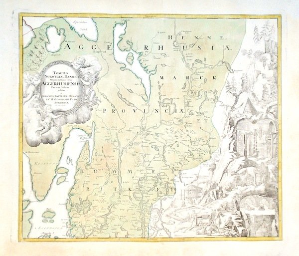 Incisione in rame, mm 480x550, colorata d'epoca. Piacevole carta raffigurante la regione di Oslo, con ricco cartiglio. Ottimo esemplare marginoso. J.B.Homann nasce a Norimberga nel 1663; lavora inizialmente per David Funk e per Giacomo Sandrart finchè, nel 1702, inizia una propria produzione cartografica, raggiungendo ben presto un notevole successo per l'eleganza e la modernità, ben amalgamando aspetto scientifico e decorativo. Nel 1707 pubblica il primo atlante, arricchendolo rapidamente fino a superare il centinaio di carte con il 'Grosser Atlas" di 126 carte. Muore nel 1723, ma la sua attività viene portata avanti dagli eredi.