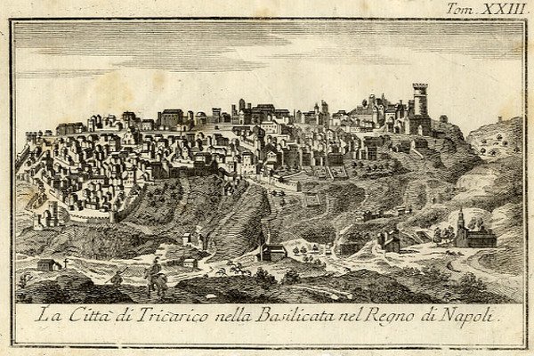 TRICARICO - "La Città di Tricarico nella Basilicata nel Regno di Napoli." Bella vedutina prospettica.