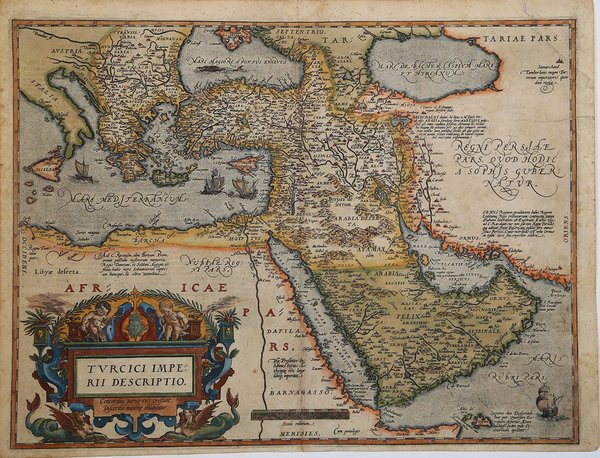Splendida mappa a colori del Medio Oriente, della Turchia e del Mediterraneo Orientale dalla Sicilia a Cipro, tratta dall'edizione tedesca del Theatrum Orbis Terrarum di Ortelius.La mappa è basata sulla mappa murale di Gastaldi in Asia. Include un cartiglio decorato, quattro velieri e mostri marini nel Mar Nero. Il ' Theatrum Orbis Terrarum ' è considerato il primo vero “atlante” moderno. L’opera fu pubblicata in 7 lingue e 36 edizioni, per il quale – nel 1570 - Ortelius ottenne il ' privilegio, ovvero una sorta di diritto d'autore che impediva ad altri cartografi di pubblicare i propri lavori. Il ' Theatrum ' rappresentava il lavoro più avanzato del lavoro della descrizione cartografica. L’Ortelius vi raccolse il sapere geografico e cartografico del suo tempo, proponendo in 147 spettacolari tavole incise l’immagine più fedele del mondo allora conosciuto e, in alcune straordinarie “carte storiche”, regioni e itinerari tratti dalla letteratura, dalla mitologia, dalla tradizione. Ortelius fu anche il primo a citare le fonti, menzionando i nomi dei cartografi nel “catalogus auctorum”. Dal 1598 al 1612 le edizioni postume del ' Theatrum ' furono realizzate dal suo collaboratore Johannes Baptiste Vrients. Incisione in rame, bellissima coloritura antica con ritocchi, in ottimo stato di conservazione. Gorgeous old color example of Ortelius' map of the Middle East, Turkey and the Eastern Mediterreanean from Sicily to Cyprus, from the German edition of Ortelius' Theatrum Orbis Terrarum. The map is based upon Gastaldi's wall map of Asia. Includes an ornate cartouche, four sailing vessels and sea monster in the Black Sea. Map taken from the ' Theatrum Orbis Terrarum, which is considered the first true modern "Atlas". The work was published in 7 languages and 36 editions, for which - in 1570 - Ortelius obtained the privilege, a kind of copyright that prevented other cartographers from publishing his works. The ' Theatrum ' represented the most advanced work of cartographic description. Ortelius collected in it the geographical and cartographic knowledge of his time, proposing in 147 spectacular engraved plates the most faithful image of the world then known and, in some extraordinary "historical maps", regions and routes taken from literature, mythology, tradition. Ortelius was also the first to cite sources, mentioning the names of cartographers in the "catalogus auctorum". From 1598 to 1612 the posthumous editions of the ' Theatrum ' were made by his collaborator Johannes Baptiste Vrients. Copperplate, with fine original colour, good condition. Cfr.