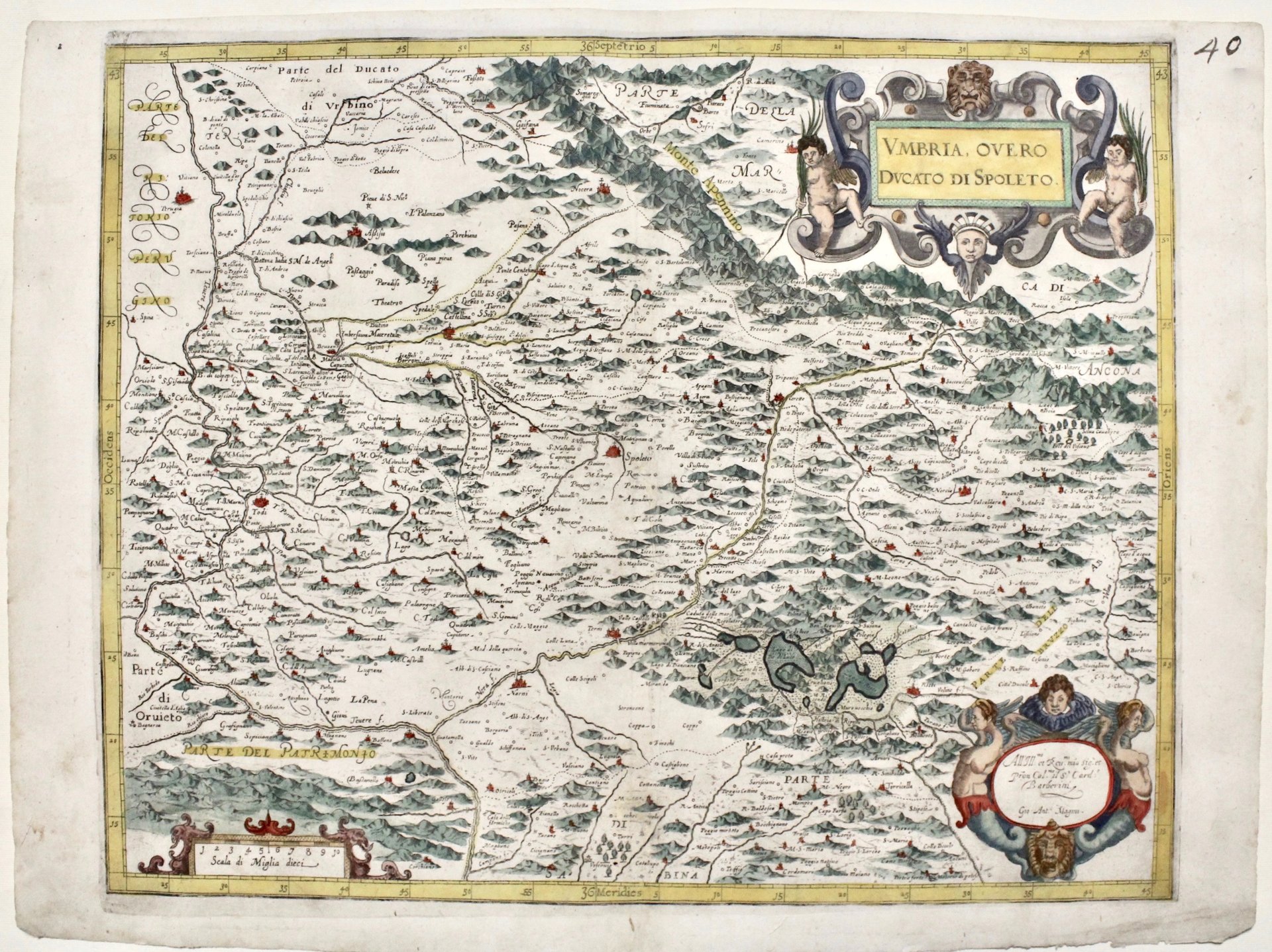 Incisione in rame, mm 380x466, dipinta a mano. Tratta da “L’Italia” il fondamentale primo atlante con 61 carte di tutta la penisola, che il geografo e matematico Magini realizzò a fine ‘500, ma che, a causa della sua morte nel 1617, fu pubblicato postumo dal figlio Fabio nel 1620. Magini si servì per le incisioni di due famosi intagliatori dell’epoca: il belga Arnoldo Arnoldi e l’inglese Benjamin Wright. Grazie ai contatti personali con le istituzioni ed i più importanti cartografi del tempo, Magini ebbe a disposizione materiale cartografico talvolta inedito o comunque non disponibile per gli studiosi. La sua opera costituì il fondamento di tutta la cartografia del XVII secolo, venendo costantemente copiata da tutti i successivi autori. Buon esemplare, presenta piccoli restauri alla piega centrale.