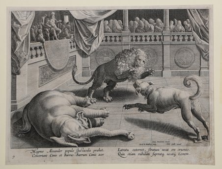 Alessandro Magno assiste a un combattimento tra un elefante, un leone e un cane; all'estrema sinistra, Alessandro assiste a un intrattenimento previsto per i personaggi su un balcone; in primo piano, a destra, un leone e un cane combattono nell'arena, a sinistra, un elefante giace a terra, dopo essere stato sopraffatto dal cane. Firmata e titolata sotto l’immagine: 'Ioan. Stradanus invent. / Carol. de Mallery sculp. / Phls Galle excud.' 'Magnus Alexander.necatq[ue] Leonem.' Bulino, circa 1596. Della serie ' Venationes Ferarum, Avium, Piscium, da disegni di Jan van der Straet detto Stradano o Stradanus (Bruges 1523 - Firenze 1605), pubblicata ad Anversa da Philip Galle. Di ritorno ad Anversa dal suo lungo viaggio in Italia, lo Stradano conobbe Philip Galle, già allievo di Hieronimus Cock e da poco dedito all’arte dell’editoria. I due progettarono la produzione di una serie di soggetti venatori, ispirati agli arazzi della villa di Poggio a Caiano. Il Galle all’inizio diede alla luce una serie di incisioni senza numerazione, alla quale fece seguita una seconda stesura composta da frontespizio e 44 tavole numerate. La fortuna immediata dell’opera convinse l’editore a proseguire la collaborazione con lo Stradano che venne così impegnato nell’esecuzione di nuovi disegni, con temi venatori esotici ed inusuali. Questo nuovo ciclo fu dapprima pubblicato separatamente, ed in seguito unito al precedente, costituendo la vasta serie di 104 tavole, intitolata appunto ' Venationes Ferarum, Avium, Piscium, Pugnae. ' La serie è databile tra il 1578 (data sul frontespizio) e il 1596. Come già gli arazzi della villa di Poggio a Caiano, l’opera è raggruppata per argomenti suddivisi in tre vaste categorie: animali terrestri, d’aria e d’acqua. All’inizio le scene di caccia furono incise dallo stesso Philip Galle che successivamente impiegò altri membri della sua famiglia ed assistenti vari quali Adriaen e Jan Collaert, Theodor e Cornelis Galle e Carolus de Mallery. Magnifica prova, impressa su carta vergata coeva, rifilata al rame, in buono stato di conservazione. Bibliografia New Hollstein (Dutch & Flemish) / The New Hollstein: Dutch and Flemish etchings, engravings and woodcuts 1450-1700 (469.I); Baroni Vannucci 1997 / Jan van der Straet, detto Giovanni Stradano, flandrus pictor et inventor (693.4). Alexander the Great Watching a Fight between an Elephant, a Lion and a Dog; at the far left, Alexander watches an entertainment provided for the figures on a balcony; in the foreground, to right, a lion and a dog fight in the arena, to left, an elephant lies flat on the ground, having been overwhelmed by the dog. Lettered within image: 'Ioan. Stradanus invent. / Carol. de Mallery sculp. / Phls Galle excud.' Plate numbered 4 in margin at left. Lettered below the image: 'Magnus Alexander.necatq[ue] Leonem.' Engraving, circa 1596. From the "Venationes Ferarum, Avium, Piscium", after Jan van der Straet called Stradano or Stradanus, published by Philip Galle. Once back in Antwerp, after a long trip to Italy, Stradano met Philip Galle, former pupil of Hieronumus Cock, who had recentely devouted himself to the art of printing. They planned together the realization of hunting subjects, inspired by the tapestry of the Villa in Poggio a Caiano. At the beginning, Galle realized a series of engravings without numbers, to which a second edition followed, with title page and 44 numbered plates. The sudden fame of his work convinced the printer to go on with his cooperation with Stradano, who realized new drawings with uncommon and exotic hunting subjects. The new series was published first separately, then together with the first edition, forming a wide series of 104 plates, named Venationes Ferarum, Avium, Piscium, Pugnae. This work can be dated between 1578 (on the front page) and 1596. As for the tapestry of the Villa in Poggio a Caiano, the work is divided in three wide categories: terrestrial, air and water animals. At the beginning the hunting scenes have been engraved by Philip Galle himself, who then hired other members of his family and other assistants, among which Adriaen and Jan Collaert, Theodor and Cornelis Galle and Carolus de Mallery. Magnificent work, printed on contemporary laid paper, trimmed to the platemark, in good condition. Bibliografia New Hollstein (Dutch & Flemish) / The New Hollstein: Dutch and Flemish etchings, engravings and woodcuts 1450-1700 (469.I); Baroni Vannucci 1997 / Jan van der Straet, detto Giovanni Stradano, flandrus pictor et inventor (693.4). Cfr.