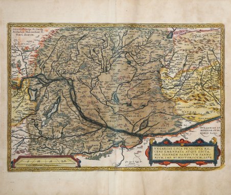 UNGARIAE LOCA PRAECIPVA RE:|CENS EMENDATA ATQUE EDITA, | PER IOANNEM SAMBUCUM PANNO:|NIVM IMP. Ms. HISTORICVM.1579. In basso al centro: "Cum Imp. et Regie Mt. | Priuilegio". All’angolo superior sinistro: Sereniss. Principi D. Carolo | Archiduci, Maximiliani II, | Fratri, Dicatum. Dedicata al serenissimo sovrano Carolus, arciduca, fratello di sua eccellenza Massimiliano secondo. Bella carta dell'Ungheria, della Transilvania orientale e della Bulgaria. Ortelius si è basato sulla carta dell'Ungheria di Sambucus, pubblicata a Vienna nel 1571. (Karrow 65/3, p. 460-461, Meurer p. 226-227). Carta tratta dal ' Theatrum Orbis Terrarum ' e che è considerato il primo vero “atlante” moderno. L’opera fu pubblicata in 7 lingue e 36 edizioni, per il quale – nel 1570 - Ortelius ottenne il ' privilegio, ovvero una sorta di diritto d'autore che impediva ad altri cartografi di pubblicare i propri lavori. Il ' Theatrum ' rappresentava il lavoro più avanzato del lavoro della descrizione cartografica. L’Ortelius vi raccolse il sapere geografico e cartografico del suo tempo, proponendo in 147 spettacolari tavole incise l’immagine più fedele del mondo allora conosciuto e, in alcune straordinarie “carte storiche”, regioni e itinerari tratti dalla letteratura, dalla mitologia, dalla tradizione. Ortelius fu anche il primo a citare le fonti, menzionando i nomi dei cartografi nel “catalogus auctorum”. Dal 1598 al 1612 le edizioni postume del ' Theatrum ' furono realizzate dal suo collaboratore Johannes Baptiste Vrients. Incisione in rame, bella coloritura coeva, in ottimo stato di conservazione. Edizione italiana del 1608, stampata da J. B. Vrients. Bibliografia M. Van den Broecke "Ortelius Atlas Maps" (2011), n. 150; L. Gróf (1979), "The Map Collector" 6: p. 2-11, (1992) "Cartographica Hungarica" 1: pp. 26-36. UNGARIAE LOCA PRAECIPVA RE:|CENS EMENDATA ATQUE EDITA, | PER IOANNEM SAMBUCUM PANNO:|NIVM IMP. Ms. HISTORICVM.1579. Middle bottom: "Cum Imp. et Regie Mt. | Priuilegio". Text block upper left corner: Sereniss. Principi D. Carolo | Archiduci, Maximiliani II, | Fratri, Dicatum. [Dedicated to the most serene ruler, Mr. Carolus, archduke, brother of his excellence Maximilian the second]. A handsome map of Hungary, eastern Transylvania and Bulgaria. Ortelius based this map on Sambucus' Hungary map, published in Vienna in 1571 (Karrow 65/3, p. 460-461, Meurer p. 226-227). The map is densely engraved with rivers, lakes, mountains and hundreds of place names, each represented by a tiny castle and tiny animals fill the blank spaces. The title spans the top of the map in a strapwork cartouche. At bottom right is a large decorative cartouche containing the rules for Hungarian consonant pronunciation of the place names. Map taken from the ' Theatrum Orbis Terrarum, which is considered the first true modern "Atlas". The work was published in 7 languages and 36 editions, for which - in 1570 - Ortelius obtained the privilege, a kind of copyright that prevented other cartographers from publishing his works. The ' Theatrum ' represented the most advanced work of cartographic description. Ortelius collected in it the geographical and cartographic knowledge of his time, proposing in 147 spectacular engraved plates the most faithful image of the world then known and, in some extraordinary "historical maps", regions and routes taken from literature, mythology, tradition. Ortelius was also the first to cite sources, mentioning the names of cartographers in the "catalogus auctorum". From 1598 to 1612 the posthumous editions of the ' Theatrum ' were made by his collaborator Johannes Baptiste Vrients. From the Italian edition of 1608. Copperplate with fine original colouring, very good condition. Bibliografia M. Van den Broecke "Ortelius Atlas Maps" (2011), n. 150; L. Gróf (1979), "The Map Collector" 6: p. 2-11, (1992) "Cartographica Hungarica" 1: pp. 26-36. Cfr.
