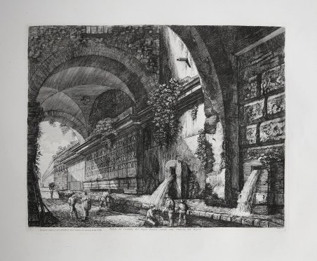 LE ANTICHITA ROMANE Tavola tratta dalla serie delle Antichità Romane, composta di 101 tavole, che viene realizzata con il ricavato della e vendita dei rami della Raccolta di cinquanta principali vedute di antichità tratte da scavi fatti in Roma in questi ultimi tempi divise in 40 vedute, edita nel 1817. Con quest’opera, per il numero delle tavole e per il formato prescelto, di grandi dimensioni, l’incisore vuole affermarsi come figura di primo piano nel mondo artistico romano. In quest’opera Rossini si cimenta in un diretto confronto con il suo predecessore G. B. Piranesi che costituisce un punto di riferimento per un incisore di vedute antiche per quanto riguarda l’originalità e l’ampiezza della riproduzione. Il Rossini, oltre a sottolineare la sua influenza nella scelta del titolo e di alcune didascalie, usa frequentemente le medesime inquadrature e identici punti di vista del maestro veneziano. Altro elemento riconducibile a Piranesi è l’uso della luce e dei forti contrasti chiaroscurali. La volontà di voler animare le vedute, restituendo il monumento al suo contesto storico e la propria inadeguatezza nel campo della figura, porta Rossini ad una collaborazione con Bartolomeo Pinelli, incisore romano, interprete e illustratore del costume e della vita popolare; a cui si devono le figure e i gruppi caratteristici che corredano le vedute. Pinelli, in alcuni casi, riprende i motivi tratti dalle sue precedenti raccolte di Costumi pittoreschi romani. ' Acquaforte, impressa su carta coeva, in ottimo stato di conservazione. ROMAN ANTIQUITIES A nice view taken from the Antichità Romane, set of 101 plates, realized with the proceeds of the sale of the plates used for Raccolta di cinquanta principali vedute di antichità tratte dai scavi fatti in Roma in questi ultimi tempi […], published in 1817. This is the work with which the artist wanted to become one of the most important artists in the Roman cultural life; we can state that if we consider the size of the work and the subject he choose. In this work Rossini tested himself with his predecessor, G. B. Piranesi, who was considered as a point of reference when it came to ancient views and originality. Rossini, was deeply influenced by Piranesi, as it can be seen in the title, the legends, the same points of views and framing. Another important element he took from Piranesi is the use of light and the contrast of chiaroscuro. In these plates Rossini reached the higher mastery of the technique, realizing also extremely particular framings and a new and complex organization of the space. In the plates quite common is the diagonal view of the subject, which gave him the possibility to elaborate more the chiaroscuro. The will to give life to his views, the reinstatement of the monuments to their historic context and the fact that he was not good with figures, brought Rossini to start a partnership with Bartolomeo Pinelli, Roman engraver and costume illustrator of daily life. He was the one who realized the figures of Rossini’s views. Sometimes Pinelli took the subjects from his previous collection Costumi pittoreschi romani. ' Etching, printed on contemporary paper, in very good condition. Cfr. Luigi Rossini incisore. Vedute di roma 1817 - 1850, catalogo della mostra a cura di L. Gavazzi, M. E. Tottoni, Roma Palazzo Braschi, 7 aprile - 15 luglio 1982. Roma