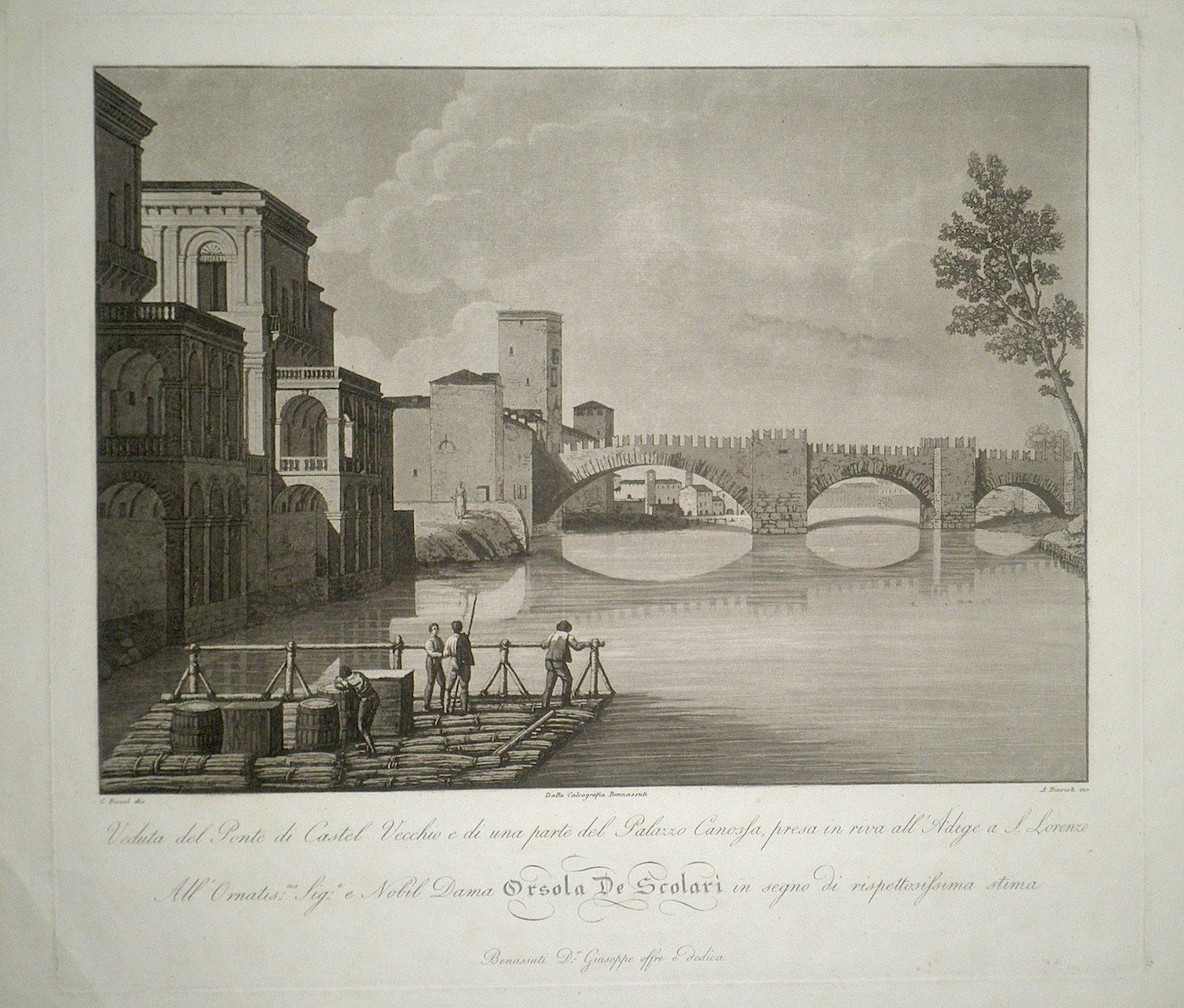 Acquatinta, mm 370x335. Magnifica veduta del Ponte di Castelvecchio e palazzo Canossa. Firma a sinistra "C. Bissol dis." e a destra "A. Biasioli inc." Dedicata alla nobildonna Orsola De Scolari. Ottimo esemplare ad ampi margini. Carlo Perini-Cesare Sinistri "Verona nelle antiche stampe", 261.