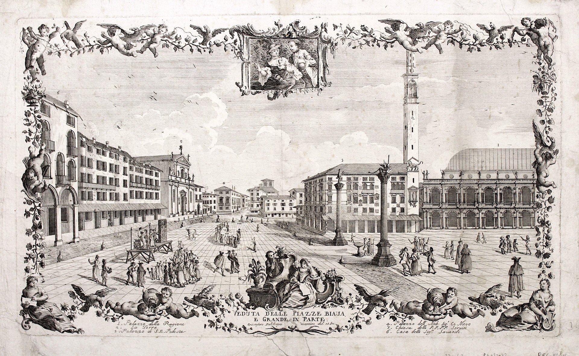 Incisione in rame all'acquaforte, 360x610. Piacevole veduta disegnata ed incisa dall'artista vicentino, che raffigura a sinistra Casa Navarchi, la Chiesa dei Padri Serviti, Palazzo Nievo, a destra il Palazzo del Podestà, La Torre e il palladiano Palazzo della ragione. La veduta fa parte della celebre serie di tredici (compresa il panorama generale) stampe che l'autore eseguì di propria invenzione. Dall'Acqua (1734-1787) iniziò la carriera presso i Remondini di Bassano, proseguendola poi da Wagner Zatta a Venezia; fu incisore di riproduzione assai ricercato dagli editori veneti. Cornice ornamentale con uccelli, putti e motivi fitomorfi. Titolo entro cartiglio ornamentale con all'interno sei rimandi numerati. Bell'esemplare con restauri a strappi marginali che interessano in qualche punto la cornice ed il titolo. Qualche leggerissima traccia di umidità e di sporco superficiale ai margini.<BR>Vicenza città bellissima, 111. <BR>