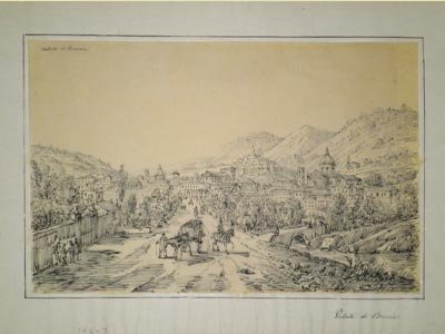 Disegno ad inchiostro nero su carta cina applicata su foglio di supporto su cui è riportato il titolo in basso a destra, manoscritto anche in alto a sinistra sulla carta cina; mm 182x275. Pietro Ronzoni (Sedrina 1781-Bergamo 1862) fu un importante pittore vedutista della prima metà del XIX secolo. Dopo un apprendistato a Bergamo, nel 1815 si trasferisce a Verona, città che gli ispira la produzione di uno splendido "Taccuino di viaggio", ripubblicato in anastatica dal Banco di Bergamo nel 1979. Qui si afferma come paesaggista di successo, molto richiesto dalla committenza. Il disegno mostra una veduta generale della città lombarda animata da un carro, alcuni popolani e vari cavalieri lungo la strada maestra che conduce alla porta di Brescia. Bell'esemplare privo di difetti eccettuato un alone all'angolo sup. destro del foglio di supporto. <BR>