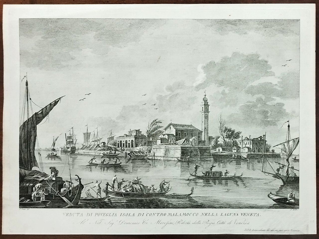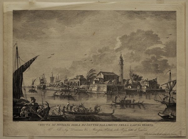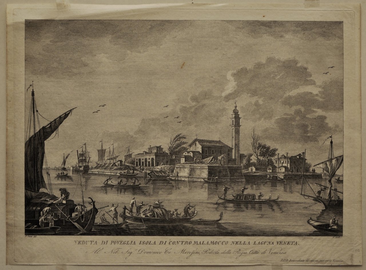 Incisione all'acquaforte e bulino di 330 x 430 mm. Secondo stato con rami del Furlanetto e su carta settecentesca. In basso in piccolo a sinistra F. Tironi del., a destra A. Sandi s. Sotto, al centro, in grande, il "titolo". Più in basso la dedica: "Al Nob. Sig. Domenico Co Morosini, Podestà della Regia Città di Venezia". Segue più in basso sulla destra, con caratteri più piccoli: " D. D. D. Bonvecchiato libraio in Merceria Venezia". Il foglio fa parte dell'opera "24 Prospettive delle isole della laguna di Venezia" stampato da Furlanetto attorno al 1785, poi ristampato da Bonvecchiato con il titolo "Descrizione di alcune isole veneziane, e siti vicini, con tav. in fol. reale 1829-1847". Questa straordinaria opera, che unisce le grandi capacità pittoriche di Francesco Tironi, con il sapiente bulino di Antonio Sandi, rappresenta la testimonianza più importante e più bella delle architetture, ma anche della vitalità, delle isole della Laguna nel settecento; per molte di esse, oggi ridotte a cumuli di macerie emergenti dalle acque veneziane, queste incisioni sono l'unica fonte documentale per ricordarne un passato decisamente più nobile. Cicogna N. 4595. (EN) Etching and burin of 330 x 430 mm. Second state with branches of Furlanetto and on eighteenth-century paper. Below, in small on the left, F. Tironi del., on the right A. Sandi s. Below, in the centre, in large letters, the "title". Further down the dedication: "To the Nob. Mr. Domenico Co Morosini, Podestà of the Royal City of Venice". It follows further down on the right, in smaller characters: "D. D. D. Bonvecchiato libraio in Merceria Venezia". The sheet is part of the work "24 Perspectives of the islands of the Venice lagoon" printed by Furlanetto around 1785, then reprinted by Bonvecchiato with the title "Description of some Venetian islands, and nearby sites, with plate in real fol. 1829 -1847". This extraordinary work, which combines the great pictorial skills of Francesco Tironi, with the expert burin of Antonio Sandi, represents the most important and beautiful testimony of the architecture, but also of the vitality, of the islands of the lagoon in the eighteenth century; for many of them, today reduced to piles of rubble emerging from the Venetian waters, these engravings are the only documentary source to remember a decidedly more noble past. Cicogna No. 4595.