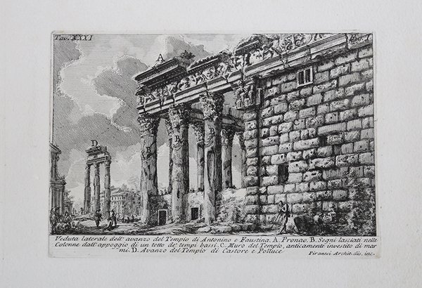 Acquaforte e bulino, 1756 circa, firmata in lastra in basso a destra. Dalla serie Le Antichità Romane. Meravigliosa prova, ricca di toni, impressa a inchiostro bruno su carta vergata coeva, con pieni margini ed in perfetto stato di conservazione. Opera tratta dalla prima edizione, pubblicata a Roma nel 1756 nella stamperia di Angelo Rotili a Palazzo Massimo alle Colonne, dai signori Bouchard e Gravier, librai e mercanti in Roma con sede presso San Marcello al Corso. La raccolta conteneva un ritratto del Piranesi, inciso da Felice Polanzani, e recava una dedica a James Caulfield conte di Charlemont, dedica poi eliminata in seguito ad un litigio. Di questa edizione originale, che venne alla luce nel maggio del 1756, sono note tre diverse tirature, connesse con le vicende del litigio con lord Charlemont, vicende documentate dal Piranesi stesso nelle sue Lettere di Giustificazione del 1757. Le diverse tirature sono riconoscibili tra loro proprio nel frontespizio del primo tomo, quello originariamente dedicato al nobile inglese, che successivamente si presenta con dedica e stemma araldico abraso, quindi con l’aggiunta di una dedica dell’autore Aevo Suo Posteri set Utilitari Publicae. Henry Focillon, nel suo saggio del 1918, suppone che il Piranesi prepari ed incida le tavole per l’opera tra il 1750 ed il 1756, tuttavia, elementi architettonici fanno risalire alcune al 1746. In realtà le tavole più antiche utilizzate nella raccolta risalgono probabilmente ad anni ancora precedenti, come sembra suggerire sia l’estrema complessità dell’opera, legata ad un lunghissimo lavoro di preparazione e ricerca, sia l’oscillazione stilistica riscontrabile comparando le varie tavole. Ad ogni modo, la grandiosità delle Antichità Romane del Piranesi non sta solamente nel grande lavoro grafico prodotto dall’artista: l’opera risulta infatti fondamentale come innovazione metodologica nel settore dell’archeologia a lei contemporanea, con l’utilizzo di scritti che sono essenziali per comprendere il pensiero dell’autore e l’innovazione del metodo piranesiano. Si può quindi sostenere, come giustamente fa notare il Focillon, che l’artista veneziano fondi l’archeologia moderna. Questa innovazione comporta, però, un enorme stacco e una grande divergenza con il pensiero e la cultura ufficiale ed accademica del periodo - di derivazione anglosassone - causando enormi polemiche di cui Piranesi fu bersaglio, e il fiorire di una negativa aneddotica intorno alla sua persona, il cui scopo era quello di ristabilire l’egemonia minacciata della cultura “classica”. Il principale pensiero espresso nelle Antichità Romane consiste nel documentare e conservare in effige un patrimonio monumentale che andava di giorno in giorno sgretolandosi, linea di condotta che andava contro l’atteggiamento culturale di amatori ed antiquari, il cui piacere era puramente estetico, non disdegnando all’occorrenza, l’asporto di frammenti anche vistosi di antichità a titolo di puro collezionismo o alla stregua di souvenir. La principale novità della sua impostazione consiste nell’unificare in un solo momento le operazioni di scavo, di rilievo, le indagini strutturali e la misurazione con lo studio delle fonti letterarie, a cui egli fa riferimento diretto. Questo momento di unificazione è rappresentato dallo studio topografico, che unito alla tecnica di rilievo, alla conoscenza dei materiali e delle tecniche antiche, allo scavo ed al sopralluogo dava luce all’archeologia, ovvero lo studio della storia antica. Etching with engraving, 1756, signed at the bottom margin. From the Antichità Romane, first edition by the French publisher Bouchard and Gravier in 1756. A great impression, printed with brown ink on contemporary laid, strong, paper, with margins, perfect conditions. The first edition of this work, in four volumes, was published in Rome in 1756 at the printing-works of Angelo Rotili at the Massimo alle Colonne Palace, by Bouchard and Gravier, book-dealers and tradesmen located in Rome near the church of St. Marcel at the Via del Corso. This collection included a portrait of Piranesi, engraved by Felice Porziani, and a dedication to James Caulfield, count of Charlemont. This dedication was later abolished in the aftermath of a quarrel, described by Piranesi in his Lettere di Giustificazione [Letters of Justification] (1757), which also gave rise to three different versions of this first original edition (May 1756). These different versions are distinguishable from the title-page of the first volume, which initially was dedicated to the Irish aristocrat, then exhibited a cancelled dedication and coat of arms and, finally, bore a Latin motto written by the artist "Aevo Suo Posteri set Utilitari Publicae". Henry Focillon, in his 1918 treatise, presumed that Piranesi prepared and engraved the plates for this collection between 1750 and 1756, although some architectural features could have a few of them dating back to 1746. Actually, the oldest plates included in this collection probably date back even further, as suggested by the extraordinary complexity of this work, due to a prolonged phase of preparation and research, together with the stylistic alterations which can be observed by comparing the different plates. The magnificence of Piranesi's Antichità Romane, however, is not only in the artist's large graphic output. Indeed, this work is of primary importance from the standpoint of methodological innovation within the framework of contemporary archaeology, with the utilisation of texts which are of essential importance for the comprehension of the author's ideas and of the innovations implied in Piranesi's methodology. It can be asserted, as correctly emphasised by Focillon, that the Venetian architect founded modern archaeology. However, this new-fashioned approach implied an important disassociation and a significant deviation from the convictions and the official and academic culture of the t