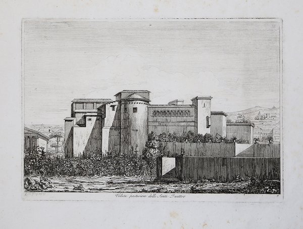 Veduta tratta dalla rara ' Raccolta di cinquanta principali vedute di antichità tratte dai scavi fatti in Roma in questi ultimi tempi. “L'opera è la riedizione di una precedente raccolta intitolata ' Frontespizio delle Antichità di Roma divise in 40 vedute ' edita nel 1817 alla quale Rossini aggiunge dieci nuove tavole. La presenza di alcune incisioni datate al 1819 induce a ritenere che l'effettiva pubblicazione dell'opera risalga a questa data piuttosto che al 1818, anno del frontespizio. Con questa raccolta Rossini esordisce nell'attività di incisore, dopo l'abbandono degli infruttuosi tentativi di affermarsi come architetto; nel 1830 ne rievocherà, nell'autobiografia, il discreto successo, pur considerandola opera di secondaria importanza, tanto da non menzionarla nei suoi cataloghi e da tralasciarla nella ristampa delle sue raccolte, personalmente curata nel 1856. Tuttavia, le vedute di antichità presentano non pochi motivi di interesse documentario per la storia dei lavori di scavo e di restauro intrapresi nella città fra l'occupazione francese e i primi anni della restaurazione. In particolare, attraverso le tavole relative al Foro Romano e ai suoi monumenti vengono documentati i lavori alle pendici del Campidoglio per l'isolamento dei templi di Vespasiano e di Saturno; i primi interventi intorno all'Arco di Settimio Severo, lo scavo promosso dalla Duchessa di Devonshire alla Colonna di Foca e lo sterro del basamento delle colonne del Tempio dei Castori. Delle grandi trasformazioni urbanistiche previste dall'Amministrazione francese, l'opera documenta l'isolamento del tempio di Vesta e l'inizio dei lavori a Piazza del Popolo. In queste prime tavole, se da un lato è evidente una certa immaturità compositiva e tecnica, dall'altro è già presente quella che poi sarà una delle costanti del Rossini: l'accuratezza e la precisione dell'esposizione finalizzata all'intento documentario, che probabilmente gli derivano dal suo tirocinio di architetto e disegnatore. La costruzione dell'immagine si avvale di schemi già collaudati ed è organizzata secondo linee semplificate che tendono a contrarre lo spazio verso il primo piano. L'inquadratura è generalmente frontale e colta dal basso verso l'alto, mentre la riduzione del campo visivo evita la necessità di articolare diversi piani in successione; anche i pochi esemplari in diagonale o a veduta panoramica non si sottraggono a questi limiti. Non sfugge ad una certa elementarità neppure il gioco luministico costituito da netti contrasti di luci ed ombre ottenuti impiegando probabilmente una sola morsura che non permette la resa di gradualità tonali. Anche il segno, duro e schematico, condotto secondo linee rette e parallele, di derivazione architettonica, tende ad accentuare l'effetto di rigidezza. Nell'esecuzione delle figure, fuori scala rispetto al monumento, già si riconosce, in alcune tavole, la maniera di Bartolomeo Pinelli. Dell'opera esistono alcuni disegni preparatori, raccolti nell'Album di 52 vedute acquerellate e 27 disegni a matita di fregi e capitelli antichi, conservato nella biblioteca Civica di Forli” (cfr. ' M. E. Tittoni in ' Luigi Rossini incisore, ' p. 42). Acquaforte, leggere ossidazioni nei margini, per il resto in ottimo stato di conservazione. Bibliografia M. E. Tittoni in ' Luigi Rossini incisore, Vedute di Roma 1817-1850, ' pp. 42-53. View taken from the rare early work by Rossini, entitled Frontespizio delle antichità di Roma divise in 40 vedute disegnate dal vero dall'architetto Luigi Rossini e da esso incise nel 1817. “L'opera è la riedizione di una precedente raccolta intitolata ' Frontespizio delle Antichità di Roma divise in 40 vedute ' edita nel 1817 alla quale Rossini aggiunge dieci nuove tavole. La presenza di alcune incisioni datate al 1819 induce a ritenere che l'effettiva pubblicazione dell'opera risalga a questa data piuttosto che al 1818, anno del frontespizio. Con questa raccolta Rossini esordisce nell'attività di incisore, dopo l'abbandono degli infruttuosi tentativi di affermarsi come architetto; nel 1830 ne rievocherà, nell'autobiografia, il discreto successo, pur considerandola opera di secondaria importanza, tanto da non menzionarla nei suoi cataloghi e da tralasciarla nella ristampa delle sue raccolte, personalmente curata nel 1856. Tuttavia, le vedute di antichità presentano non pochi motivi di interesse documentario per la storia dei lavori di scavo e di restauro intrapresi nella città fra l'occupazione francese e i primi anni della restaurazione. In particolare, attraverso le tavole relative al Foro Romano e ai suoi monumenti vengono documentati i lavori alle pendici del Campidoglio per l'isolamento dei templi di Vespasiano e di Saturno; i primi interventi intorno all'Arco di Settimio Severo, lo scavo promosso dalla Duchessa di Devonshire alla Colonna di Foca e lo sterro del basamento delle colonne del Tempio dei Castori. Delle grandi trasformazioni urbanistiche previste dall'Amministrazione francese, l'opera documenta l'isolamento del tempio di Vesta e l'inizio dei lavori a Piazza del Popolo. In queste prime tavole, se da un lato è evidente una certa immaturità compositiva e tecnica, dall'altro è già presente quella che poi sarà una delle costanti del Rossini: l'accuratezza e la precisione dell'esposizione finalizzata all'intento documentario, che probabilmente gli derivano dal suo tirocinio di architetto e disegnatore. La costruzione dell'immagine si avvale di schemi già collaudati ed è organizzata secondo linee semplificate che tendono a contrarre lo spazio verso il primo piano. L'inquadratura è generalmente frontale e colta dal basso verso l'alto, mentre la riduzione del campo visivo evita la necessità di articolare diversi piani in successione; anche i pochi esemplari in diagonale o a veduta panoramica non si sottraggono a questi limiti. Non sfugge ad una certa elementarità neppure il gioco luministico costituito da netti contrasti di luci ed ombre ott