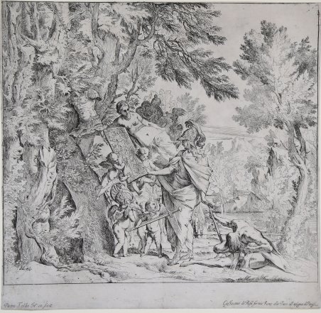Acquaforte, circa 1640, firmata in lastra in basso a sinistra. Esemplare nel secondo stato di due, con l’indirizzo dell’editore Giacomo de’ Rossi. Magnifica prova, ricca di toni, impressa su carta vergata coeva con filigrana “giglio su tre monti nel doppio cerchio” (Heawood 1624 databile 1637/46), rifilata al rame, alcune pieghe di carta, per il resto in eccellente stato di conservazione. La scena si riferisce all’episodio dell’Eneide di Virgilio nel quale Venere scende sulla Terra per consegnare al figlio Enea le armi forgiate per lui da Vulcano. Enea è raffigurato in ammirazione dello scudo, mentre due putti gli porgono la spada e l’elmo. Magnifica prova di questa famosa incisione del Testa. La vicenda artistica di Pietro Testa, detto il Lucchesino dalla sua città d’origine, è assai tormentata. Poco o nulla si sa del suo primo apprendistato nella città natale. Arrivato a Roma nel 1629, fu probabilmente dapprima a scuola presso il Domenichino, poi presso la bottega di Pietro da Cortona, suo vero maestro. Il carattere introverso dell’artista gli procurò comunque sempre difficoltà con ' i suoi colleghi: il Cortona infatti fu costretto a cacciarlo dalla sua scuola per l’atteggiamento di sprezzante superiorità assunta dall’allievo . Il Testa frequentò allora la casa del suo primo mecenate, il celebre collezionista Cassiano del Pozzo, per il quale eseguì disegni dall’antico. Fu probabilmente nella sua casa che conobbe il pittore Nicolas Poussin, che influenzerà profondamente la sua arte sia nella sua prima fase di adesione tizianesca ' al movimento neo-veneto, sia nel periodo più maturo, a partire dagli anni 1635 in poi, caratterizzati da un intellettualismo classicheggiante. Resta comunque il fatto che le sue incisioni (che ammontano a 40 tavole circa) furono considerate fin dall’antichità, a partire dal Sandrart e dal Baldinucci, le opere grafiche più importanti del '600 italiano. Etching, circa 1638-40. In wide bottom margin 'Pietro Testa in et fecit' and with publication line 'Gio Jacomo de Rossi formis Rome alla Pace all'insegna di Parigi'.Example of the seocnd state, with de Rossi' address.A fine impression, printed on contemporary laid paper with "double encircled fleur-de-lys and three mounts" watermark (Heawood 1624, circa 1637/46),trimmed to the platemark, few light vertical folds, othrwise very good condition.The scene represents the story of Venus giving arms to Aeneas, based on Virgil's account in the Aeneid (8, lines 597-731). To aid Aeneas in his battle against Turnus and in the eventual founding of Rome, Venus appeals to Vulcan to make weapons for her son. As Aeneas marshalls in his forces, Venus waits until she sees him alone in a secluded vale beside the cool stream od Caere. She appears to gim in person and sets up the shining arms on an oak tree. At the bottom of the shield presented to Aeneas the she-wolf suckles Romulus and Remus, descendants of Aeneas and the mythical founders of Rome, beside the Tiber. At the top sits Augustus Caesar, the first Roman emperor, with the orb of empire in his right hand. To the left is a cuirass, a military trophy, and beneath his feet are conquered peoples. Behind him to the right are the silver goose and temple that Vulcan placed on the shield to prophesy the arousal of Manlius by the cackling of the Capitoline geese to defend Rome against the Gauls. ' Magnificent proof of this famous work of Pietro Testa. Pietro Testa was called Lucchesino for he was born in Lucca. There are but a few news about his apprenticeship in his hometown; for sure, he went to Rome in 1629 to study in the school of Domenichino first and then, towards the end of the year, he moved to the studio of his real master, Pietro da Cortona. His introvert temper caused him a lot of troubles; Cortona, in fact, was obliged to send him away due to his hostile and disdainful behaviour. Testa went then to the house of his first patron, the famous collector Cassiano del Pozzo, and for him he realized his drawings from antiques. Maybe it was in this house that he met Nicolas Poussin who deeply influenced his art both in the neo-Venetian phase and the intellectual classicist one, from 1635. His engravings though, about 40 pieces, have been considered, starting from Sandrart and Bladinucci, the most important graphic works of the Italian XVII century. Cfr. Cropper 1988 59.II; Bartsch, XX, 24; Bellini 17 II/II; Massari, Tra Mito e Allegoria, p. 520, 213.