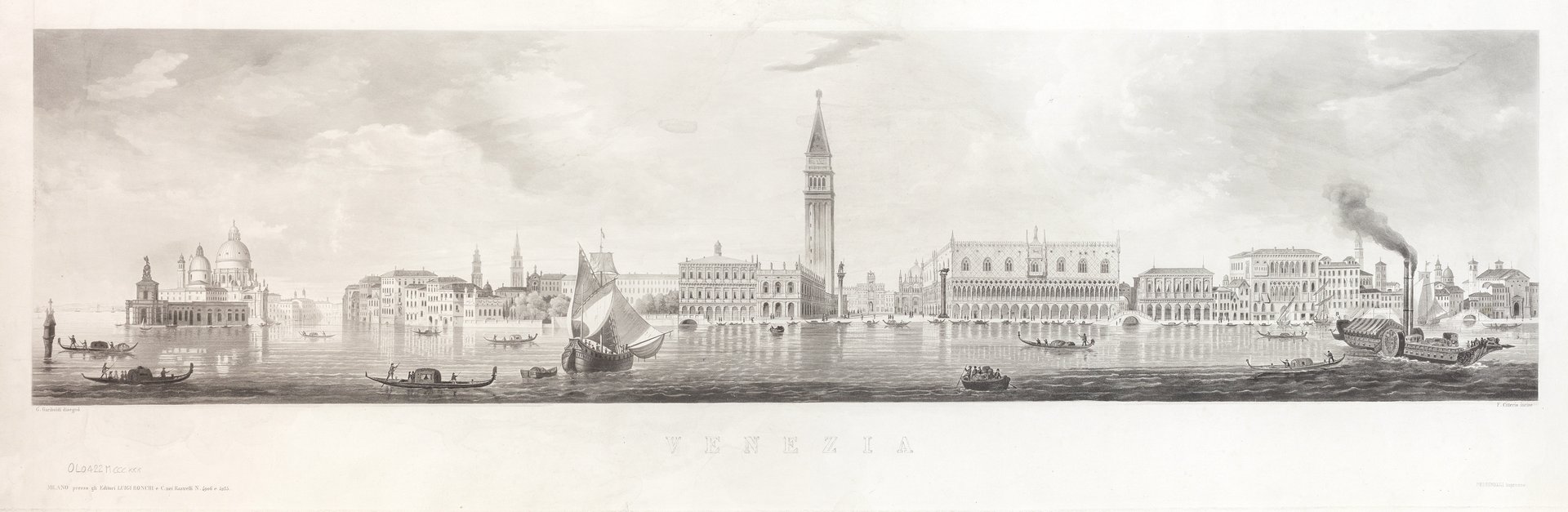 Incisione in rame all'acquatinta, mm 257x875 (parte incisa) più ampi margini, firmata a sinistra "G. Gariboldi disegnò" e a destra "F. Citterio incise", stampata presso l'editore Luigi Ronchi. Splendida veduta panoramica colta dal centro del bacino di San Marco, che raffigura il profilo cittadino dalla Dogana a sinistra fino alla chiesa di San Zaccaria a destra. La veduta è animata da numerose imbarcazioni di vario tipo. Alcuni piccoli restauri e lievi aloni ma esemplare complessivamente ben conservato.