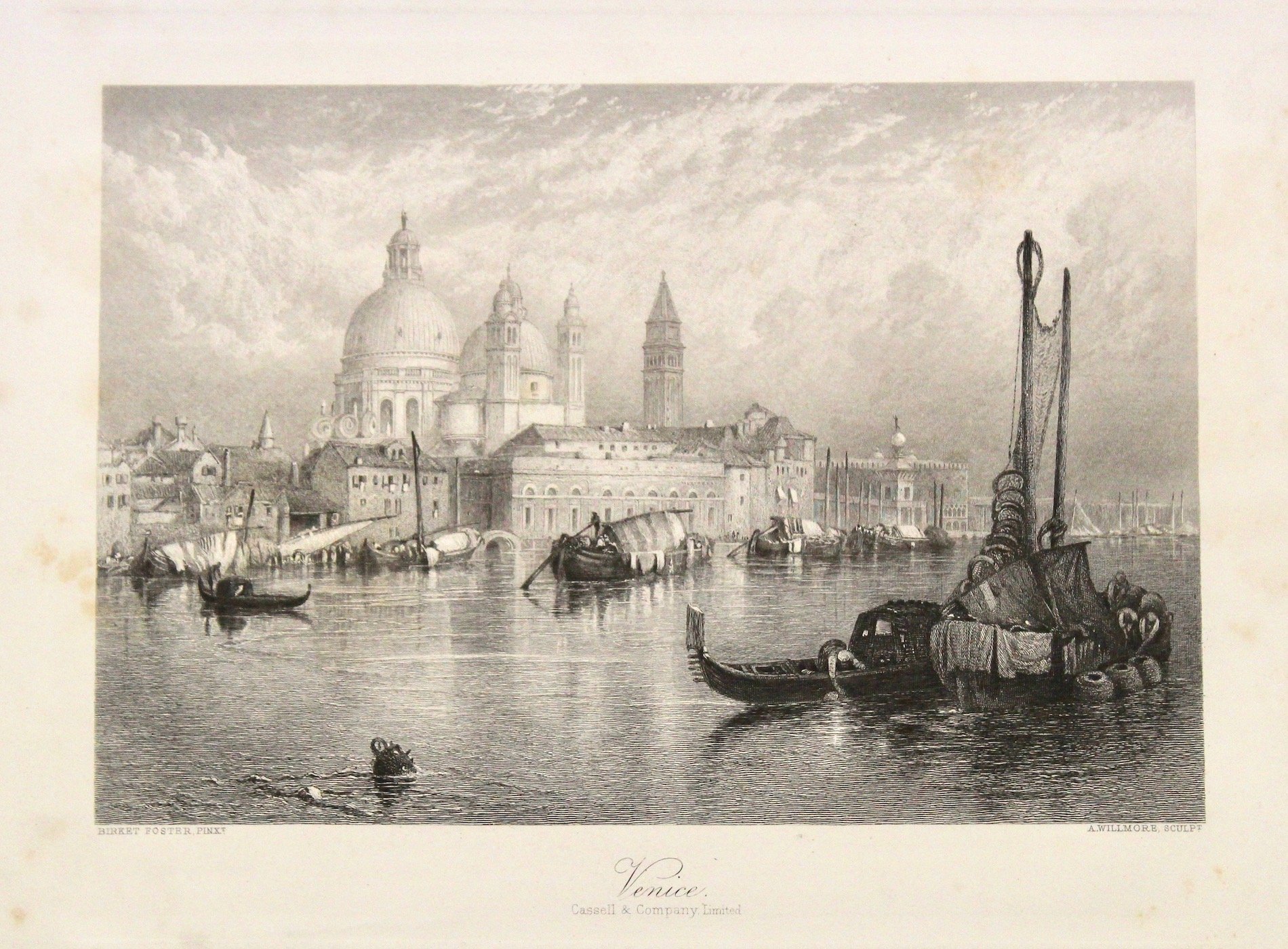 Incisione in acciaio da soggetto di Birket Foster, 154x233. Veduta della chiesa della Salute vista dal canale della Giudecca verso San Marco. Bell'esemplare con lieve alone all'angolo inf. destro.