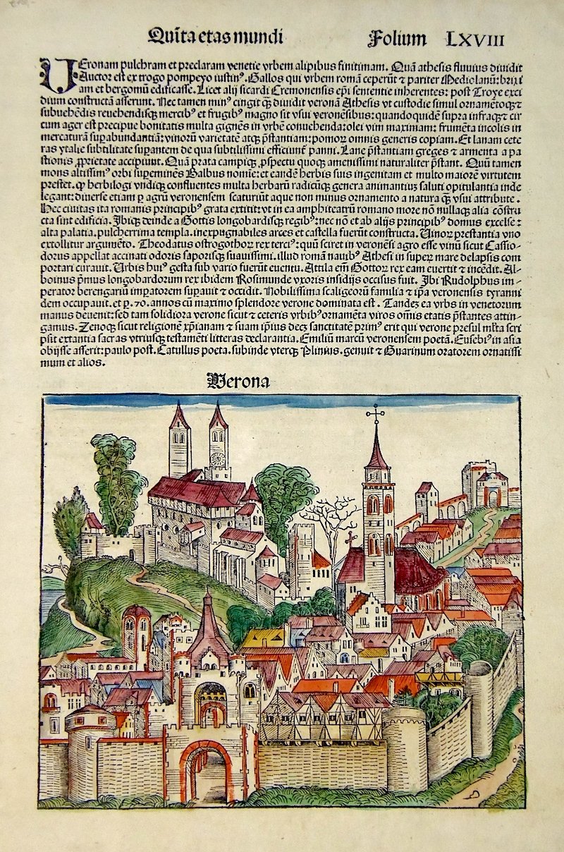 Silografia, colorata, mm 190x220 (l'immagine), mm 450x295 (il foglio, con testo in latino). Veduta fantastica della città con relativa descrizione con testo latino. Il "Liber Chronicarum" comunemente chiamato "Cronaca di Norimberga" dalla città di stampa, fu la prima opera contenente anche raffigurazioni reali delle città del mondo ed ebbe un enorme successo, tale da essere considerata una pietra miliare nello sviluppo della conoscenza geografica. Ottimo esemplare.