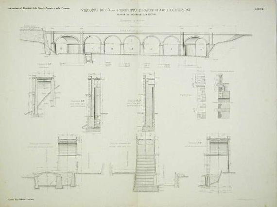 Prospetto e particolari del viadotto Riccò sulla linea ferroviaria dei Giovi